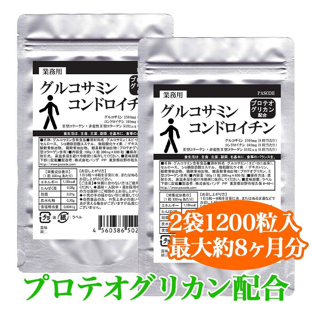 グルコサミン コンドロイチン サプリ2袋セット 高級成分プロテオグリカン配合。大容量 2袋で1200粒(最大約8ヶ月分)