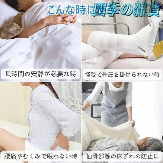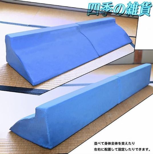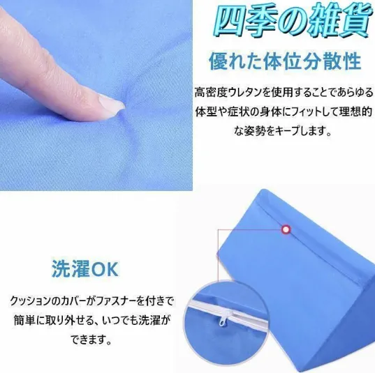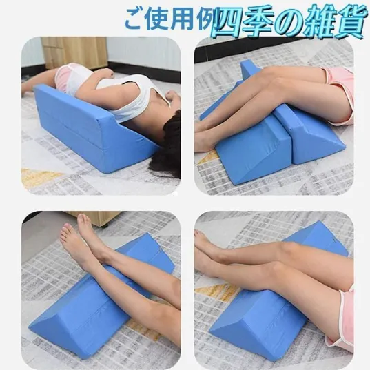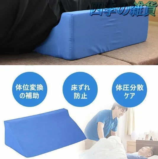 【どんな時に使うの】三角クッションは長時間の安静が必要な時、怪我で外圧を掛けられない時、腰痛やむくみで眠れない時、仙骨等の床ずれが痛い時、このような場面でご使用いただけます。