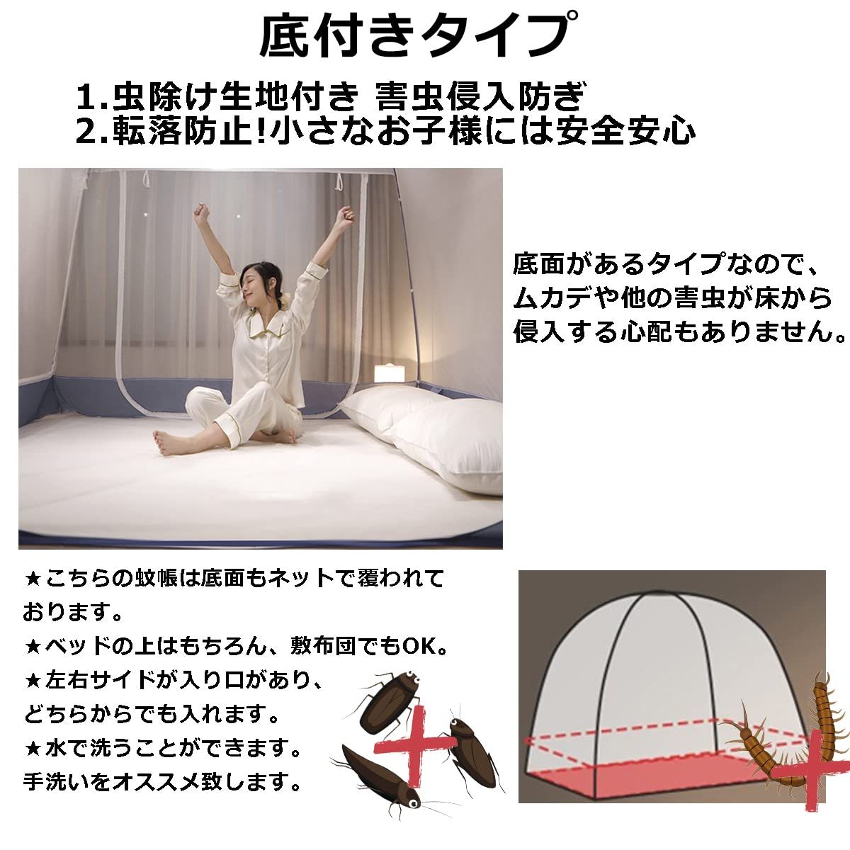 【蚊帳 底付き】底にも強度の高い生地を張り、全方位を覆うテントタイプなので、床からの侵入も防ぎます、底面があるタイプなので、害虫が床から侵入する心配もありません。ムカデやゲジ、ゴキブリなどから守ることができるので、小さなお子さまや高齢者の方にもオススメのアイテムです。