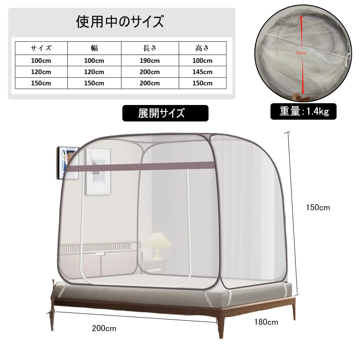 【製品情報】展開サイズ:(約):幅180×奥行200×高さ150cm,収納時サイズ(約):φ60cm,重量(約):1.4kg(収納袋込み)。素材:蚊帳は丈夫なポリエステル素材、レース生地を採用しております。フレーム:スチール。無臭、肌触りの良い、洗いやすい、風通しが良い、耐久性に優れています。