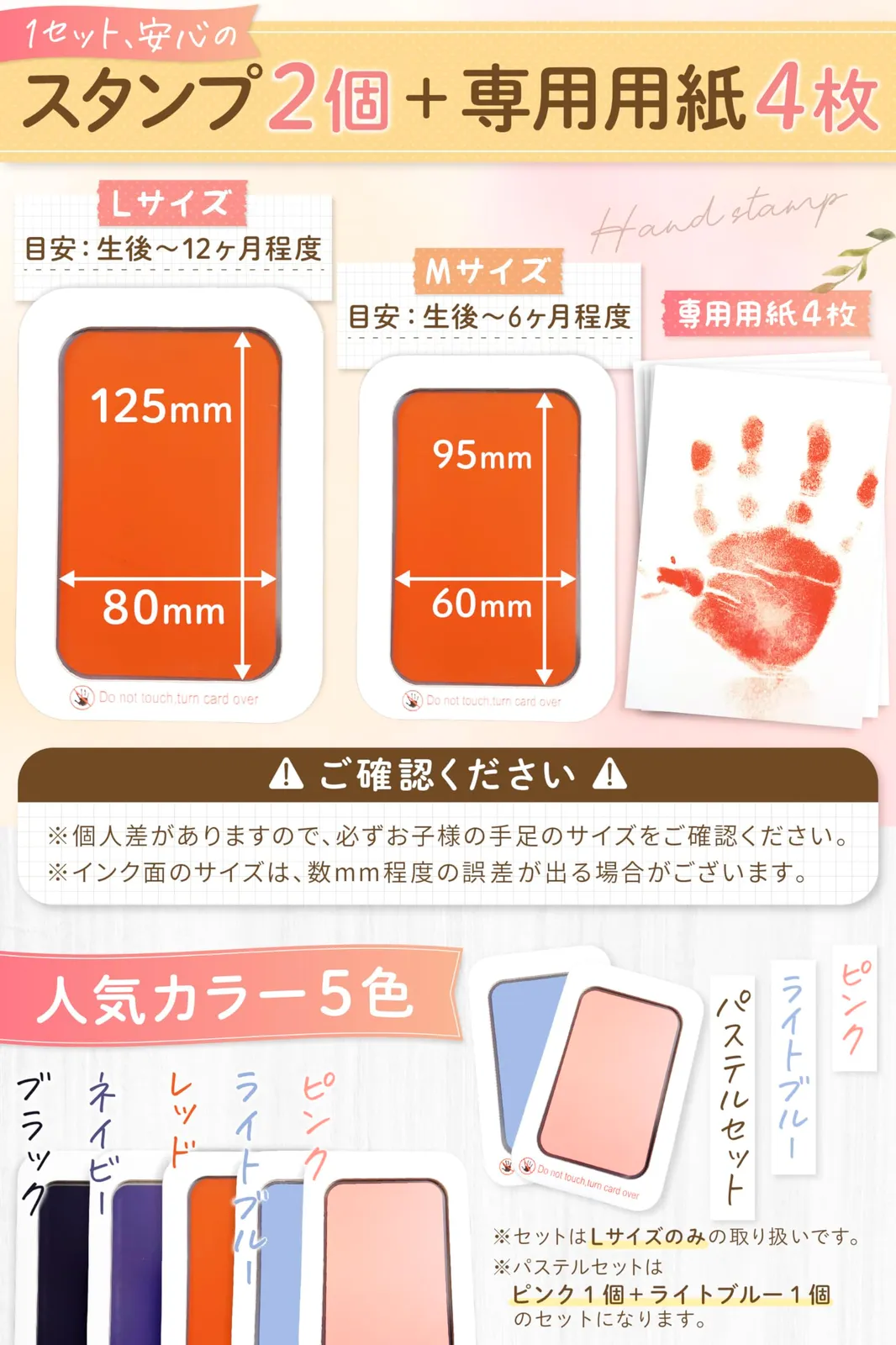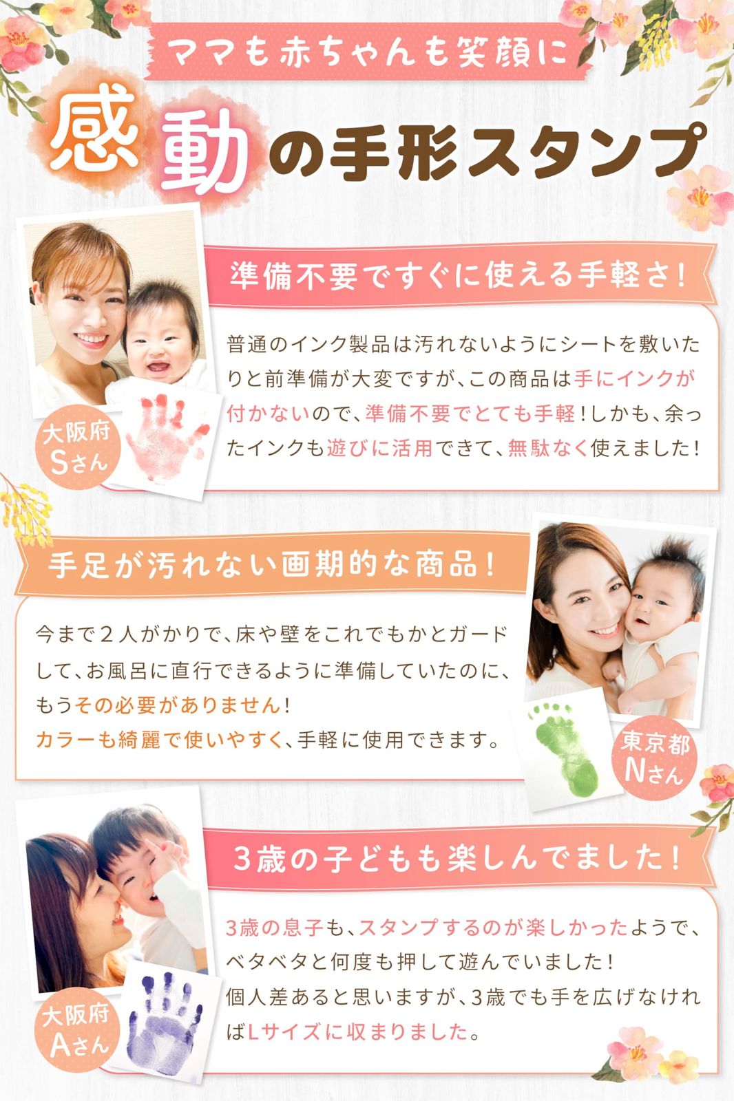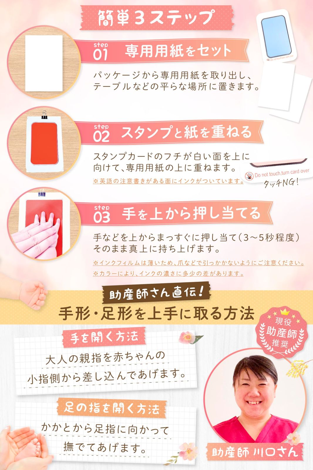 【手足が汚れない】フィルム部分に手や足を押しつけるだけで、手足を汚すことなく手形・足形が取れます。ペットにも使用できますが、インクフィルムは薄いため、爪などで破らないようご注意ください。 ※個人差がありますので、必ず手足のサイズを確認してご購入下さい。
