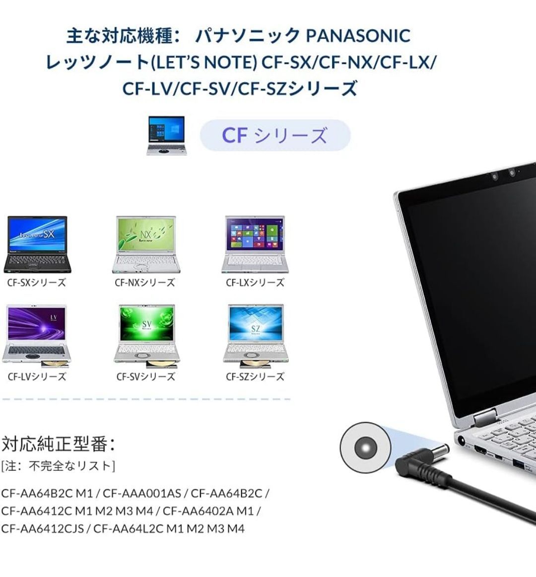 【対応機種】 レッツノート ac アダプター パナソニック パソコン Let's note CF-F8G(WXGAモデル) CF-W9 CF-W8 CF-W7 CF-T9 CF-T8 CF-T7 CF-S9 CF-S8 CF-N9 CF-N8 CF-J9シリーズ ノートパソコンじゅうでんケーブル、Panasonic PC CF-AA64L2CJS 充電器 ノートパソコンじゅう電気、TOUGHBOOK CF-20 CF-C2 CF-C CF-H1C CF-H1フィールドモデル、CF-U1Gシリーズ レッツノート ACアダプター CF-AA6412C M1 M2 M3 M4 CF-AA6402AJS CF-AA6402A M1 M2 M3 等に対応
