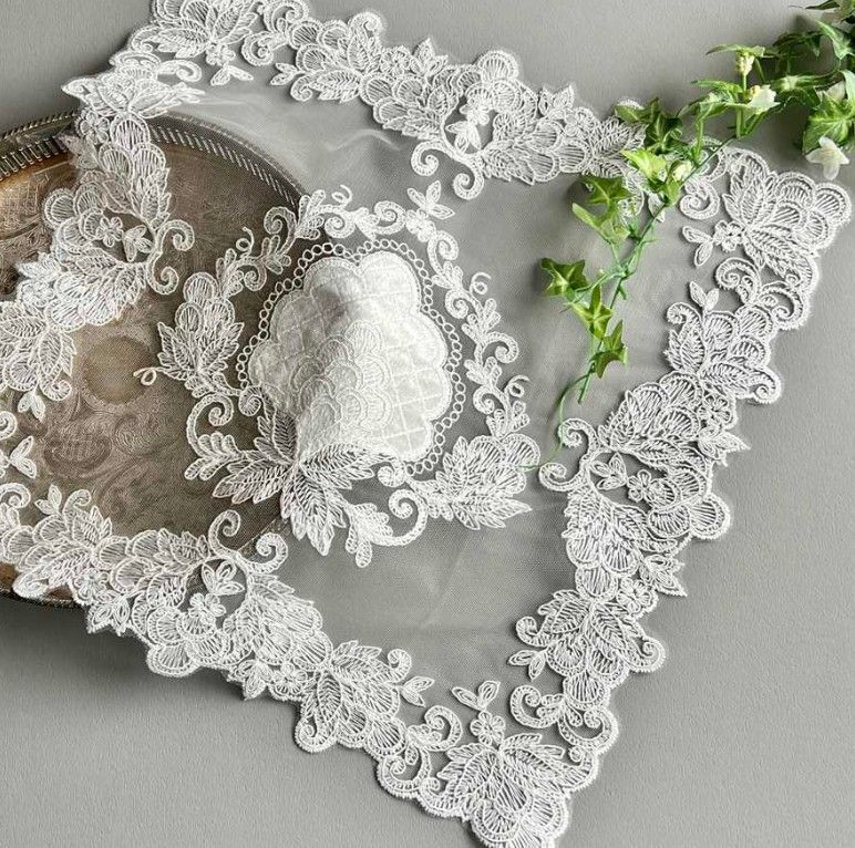 繊細な刺繍が紡ぐ優雅 — ホワイトレース テーブルセンター 40cm角