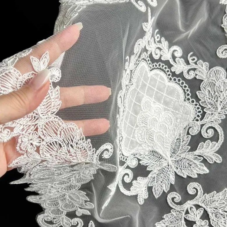 中央に咲く優雅な花、周囲を舞う蝶や葉のモチーフ。一針一針丁寧に施された立体的な刺繍は、光を受けて美しい陰影を生み出します。透け感のあるチュール地に浮かび上がる純白の模様が、まるで雪の結晶のよう。