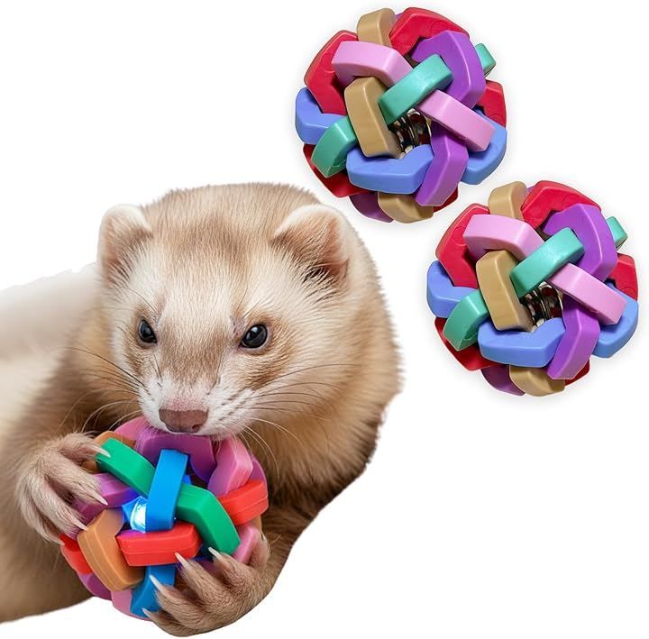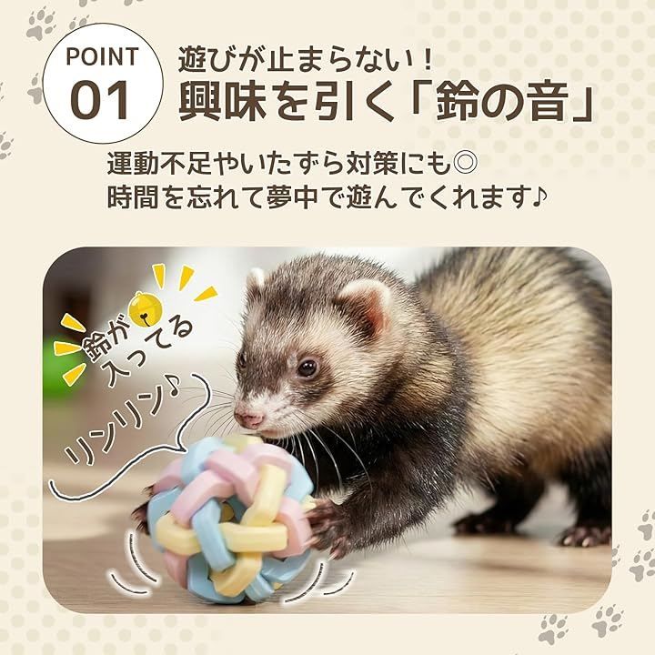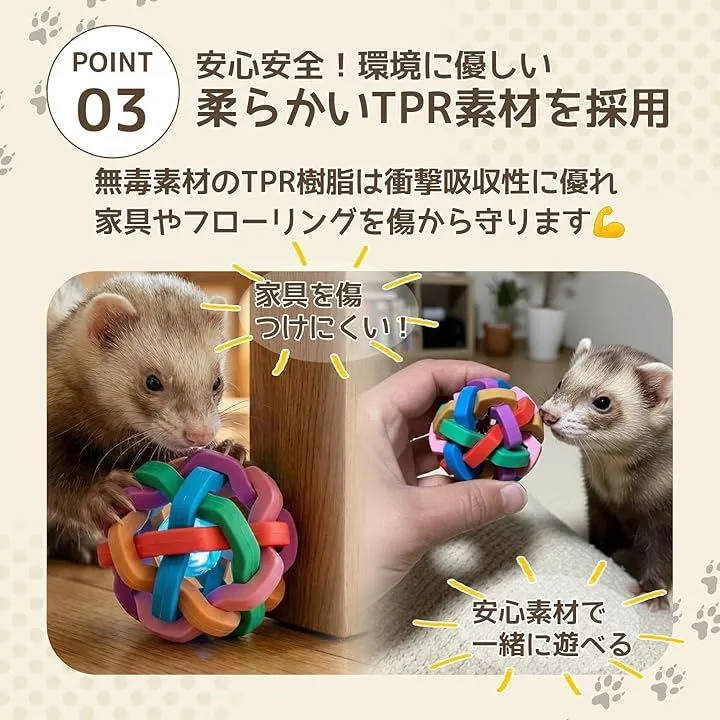 鈴入りで興味を引きつけるカラフルボール_明るい色と内部の鈴がフェレットの狩猟本能を刺激し、転がす・くわえる・追いかけるといった多彩な遊びを引き出します。