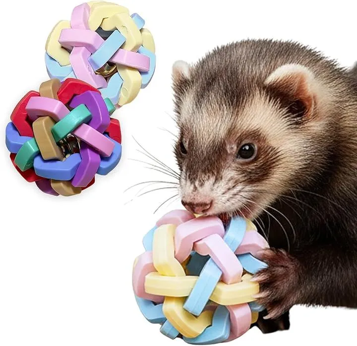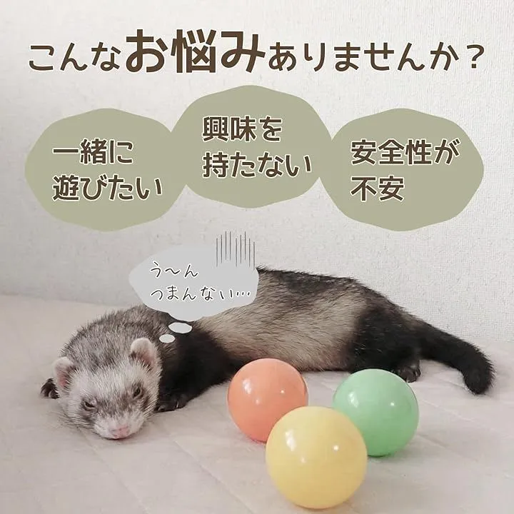 鈴入りで興味を引きつけるカラフルボール_明るい色と内部の鈴がフェレットの狩猟本能を刺激し、転がす・くわえる・追いかけるといった多彩な遊びを引き出します。