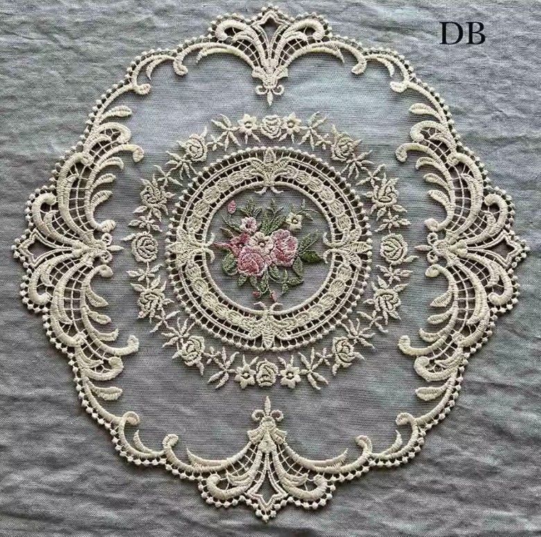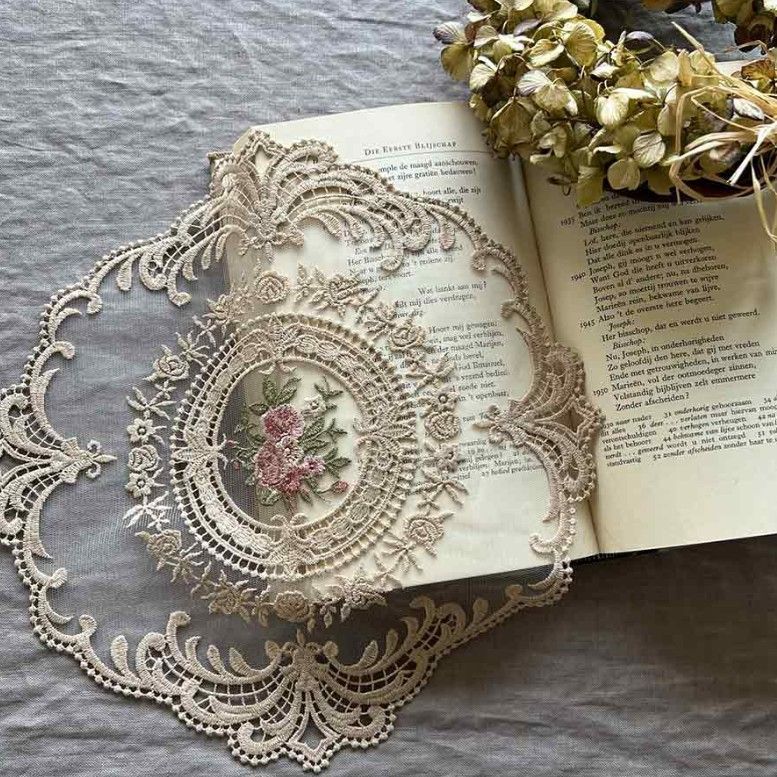 繊細なメダリオンレースの中央に、優しく刺繍されたブーケ。まるで物語の1ページのような、上品でシックなドイリーです。
