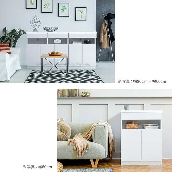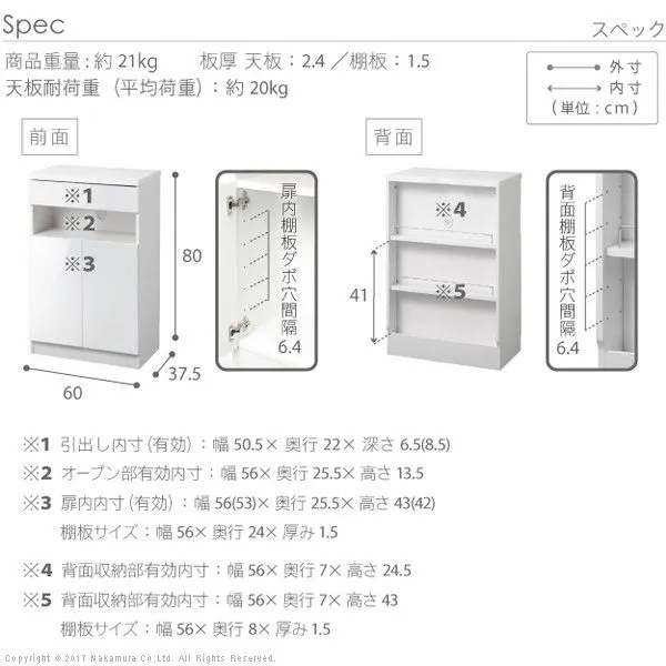 【サイズ】 本体:幅60x奥行37.5x高さ80cm 重量:約21kg 引出内寸(有効):幅50.5x奥行22x高さ6.5(8.5)cm オープン部有効内寸:幅56x奥行25.5x高さ13.5cm 扉内内寸(間口):幅56(53)x奥行25.5x高さ43(42)cm 棚板サイズ:幅56x奥行24cm・厚み15mm ダボピッチ(扉内・背面):6.4cmピッチで5穴 背面収納部有効内寸(上段):幅56x奥行7x高さ24.5cm 背面収納部有効内寸(下段):幅56x奥行7x高さ43cm 背面収納部棚板サイズ:幅56x奥行8cm・厚み15mm