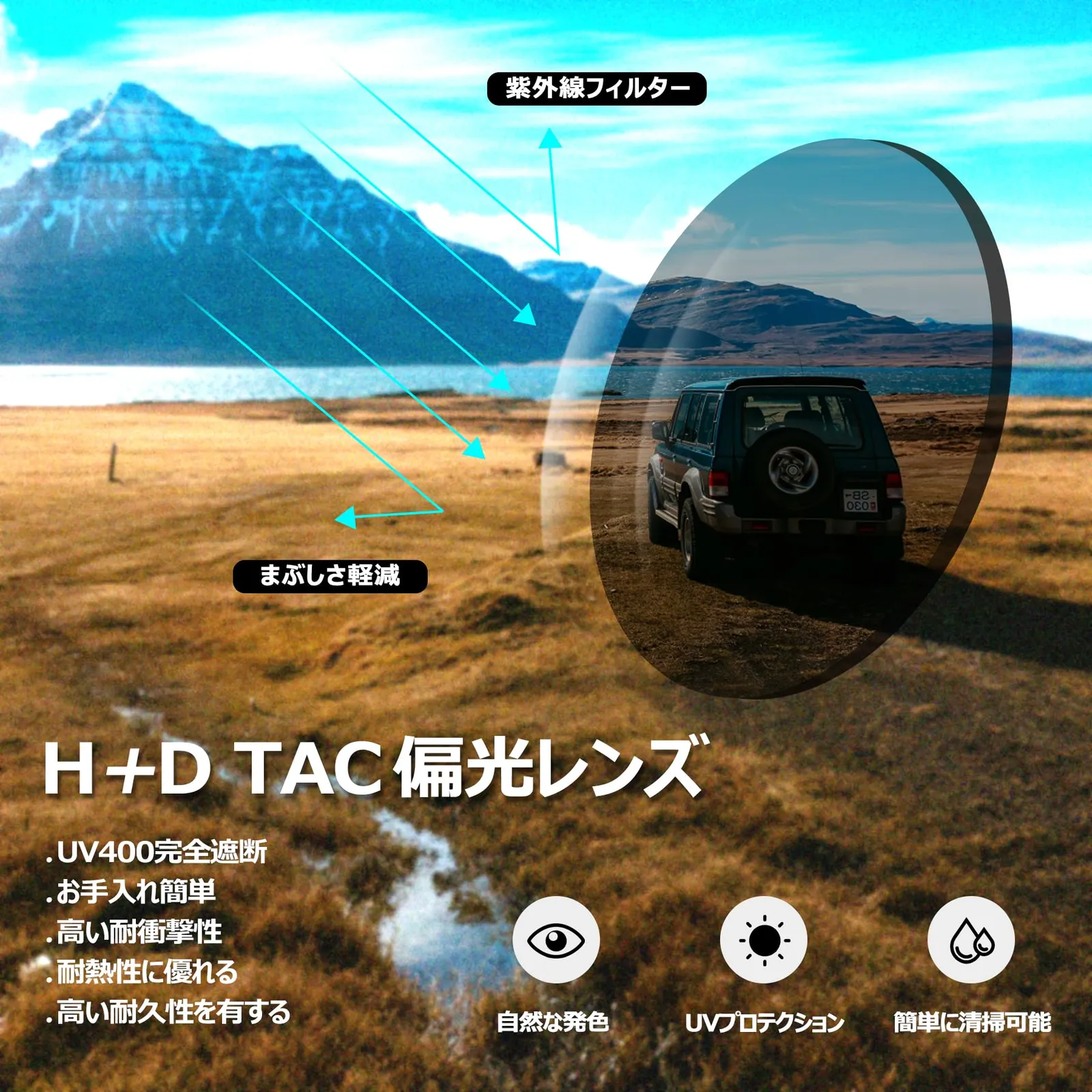 【TAC偏光レンズ】運転用サングラスは多層TAC偏光レンズとUV400技術を融合。水面や路面からの乱反射グレアを効果的に除去し、クリアな視界を提供するとともに、紫外線から目を全方位に保護します