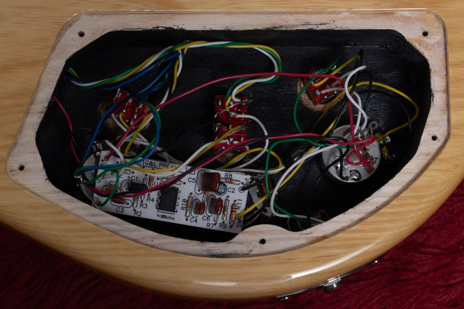PUの切り替えはもちろん、配線やプリアンプのバイパスなど、ミニスイッチによってあらゆる調整が可能な点はG&Lだからこそ。