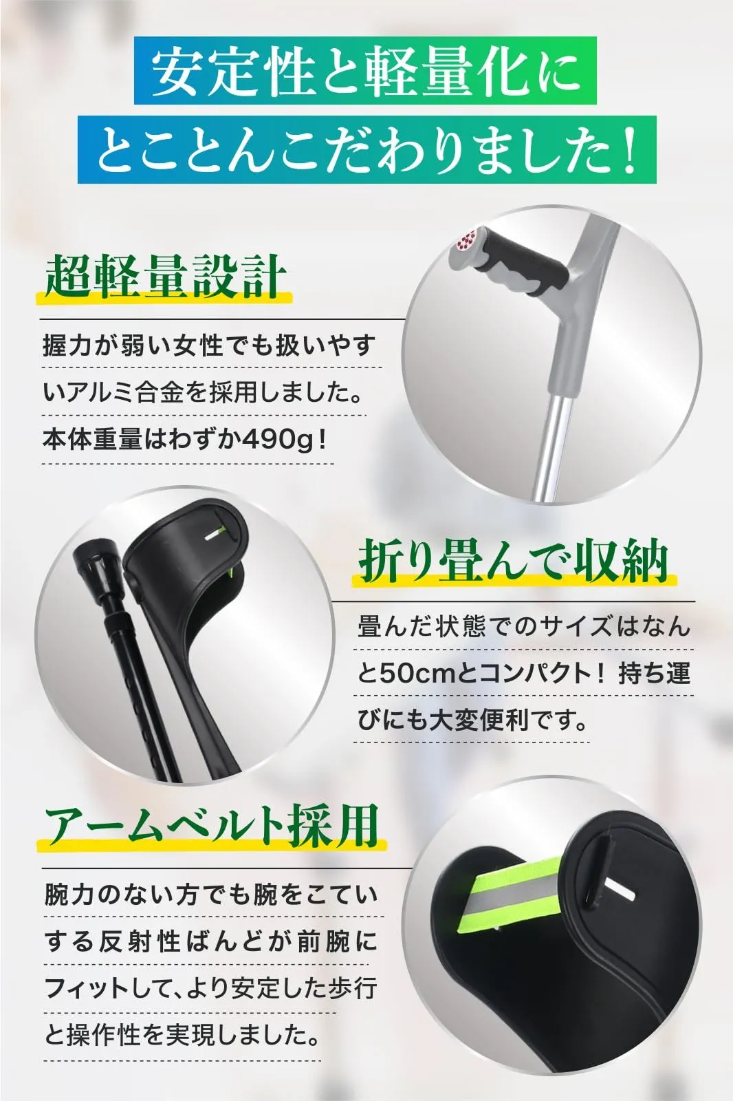 【超軽量&折りたたみ式で持ち運びラクラク】扱いやすいアルミ合金採用 **重さわずか490g(1本)**の軽量タイプ 使用しないときは50cmまでコンパクトに折りたたみ可能 お出かけ時のカバンにも収納しやすく、旅行や通院にもぴったりです。 ?
