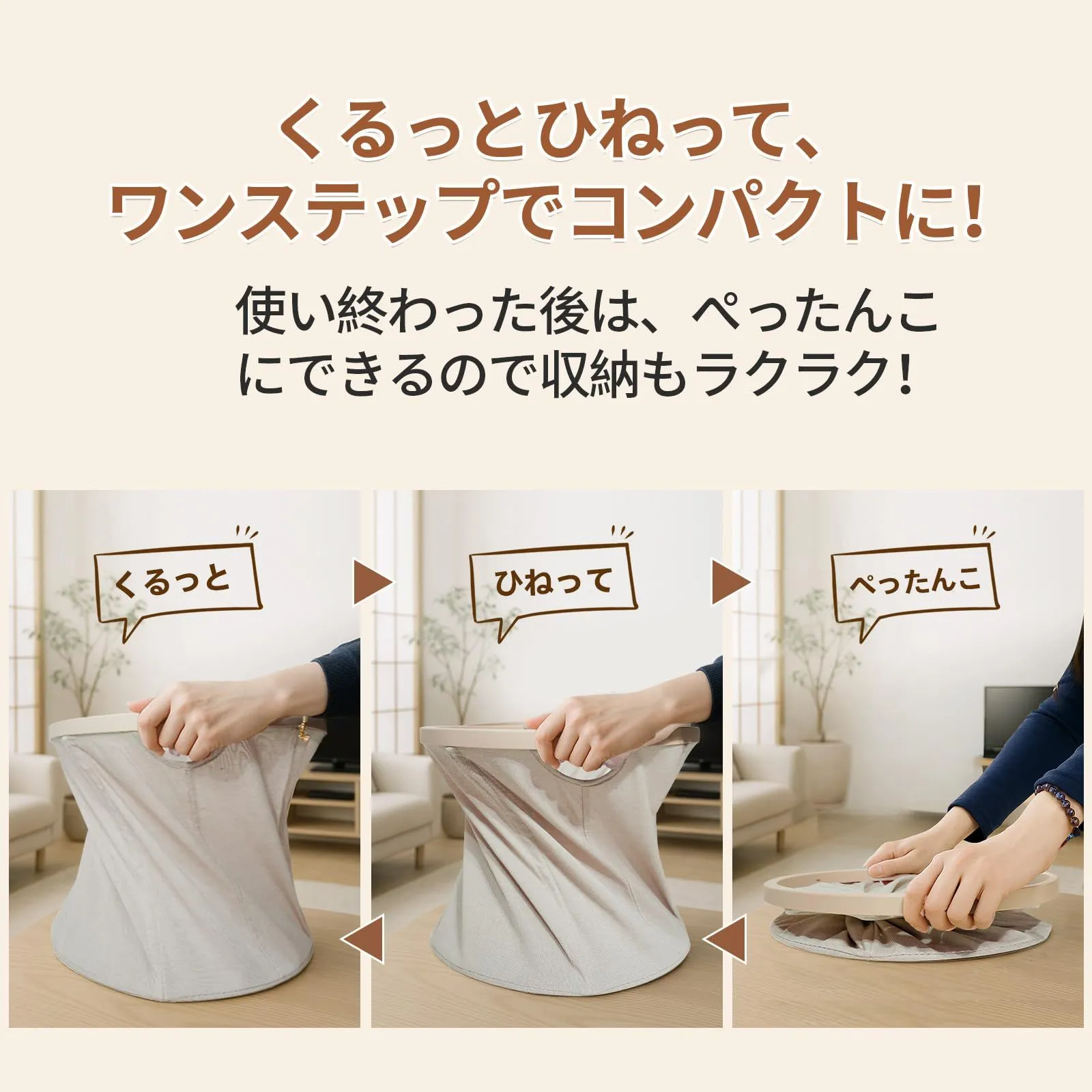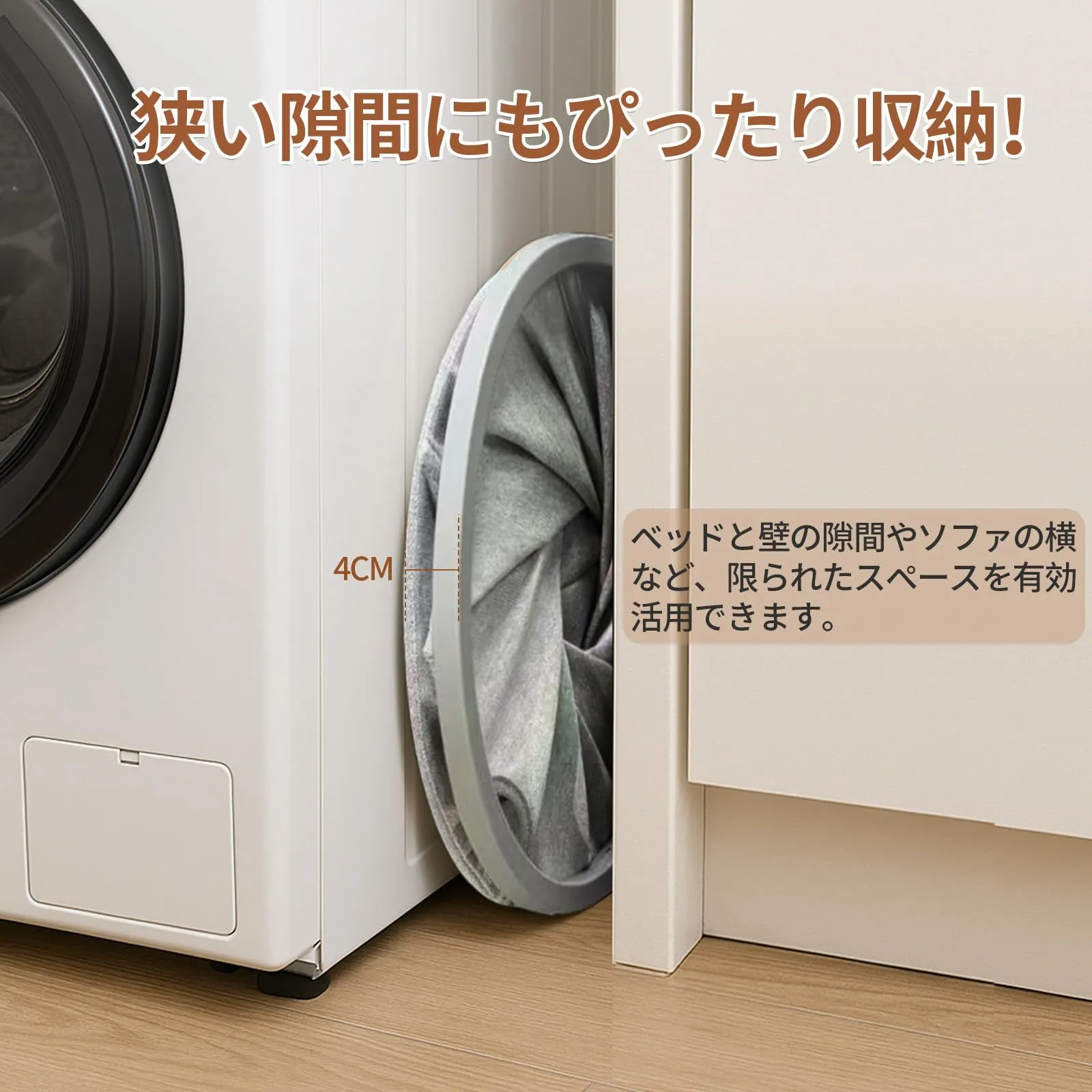 【くるっとひねって、ワンステップでコンパクト収納】わずかな手間で、簡単に「きゅっ」とコンパクトにまとめることができます。 使いたい時にはすぐに広げて、使い終わったらぺったんこに。さらに、折りたたんだ後の厚さはわずか4cmなので、狭い隙間にもぴったり収納! ベッドと壁の隙間やソファの横など、限られたスペースを有効活用できます。使わない時は簡単に折りたたんで収納でき、スペースを無駄にしません。場所を取らず、収納も非常に簡単です。毎日の使用がとても便利で楽しく感じられます。