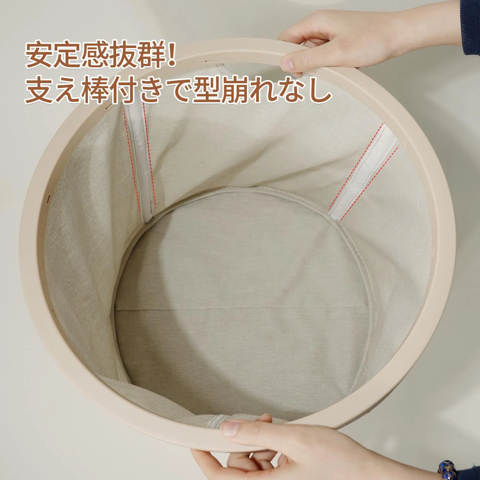 【支え棒付きで型崩れなし】このランドリーかごは、四周に支?柱が備わっており、洗濯物を入れても型崩れすることなく、しっかりとした形を保ちます。洗濯物を収納しても、常に整った状態で使用でき、使いやすさが向上します。