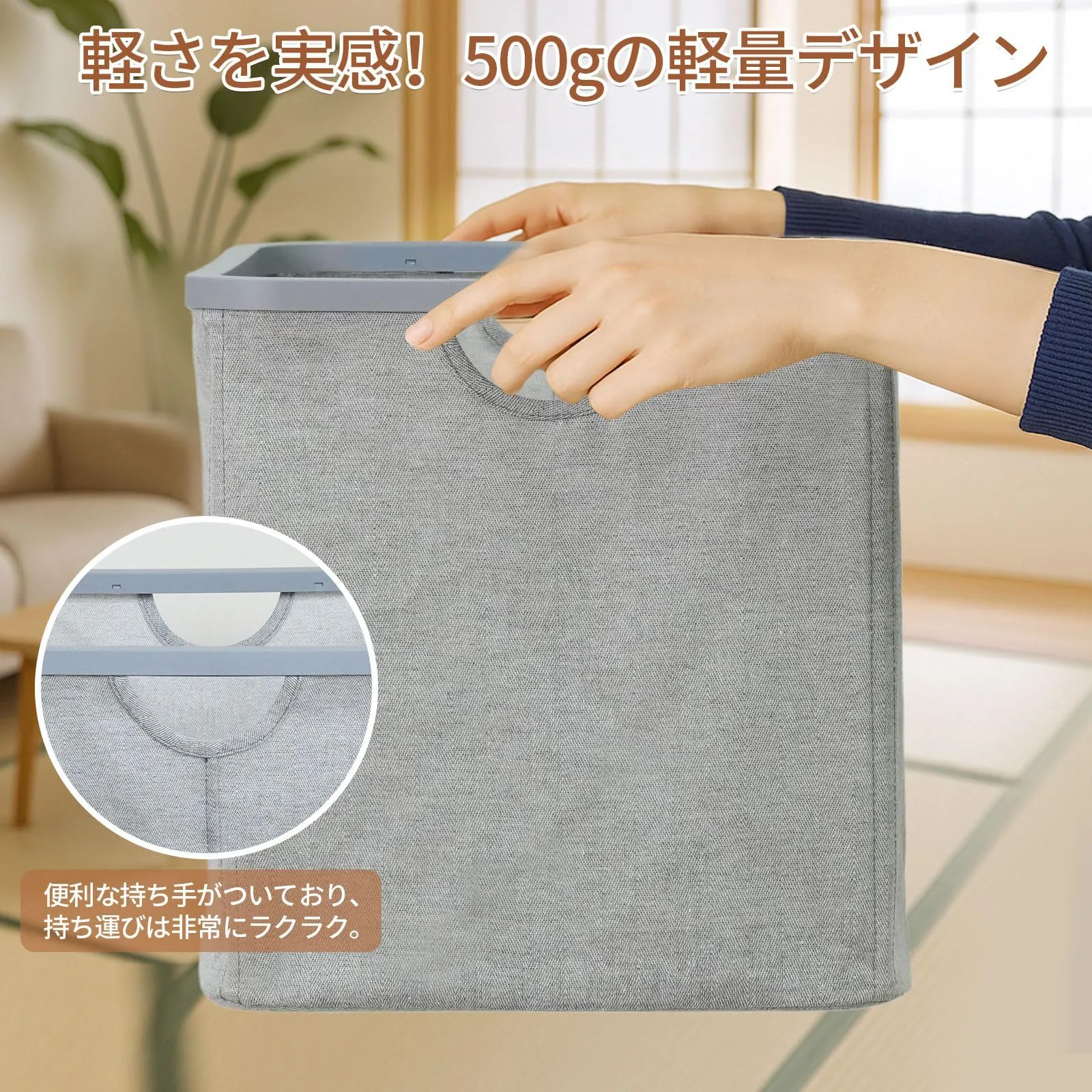 【持ち運びはラクラク】軽さを実感!500gの軽量デザイン。手に持つだけでその軽さを実感できます。どんなにたくさんの洗濯物を入れても、持ち運びは非常にラクラク。便利な持ち手がついており、手提げとしても使いやすいので、日常的に使うのにぴったりです。