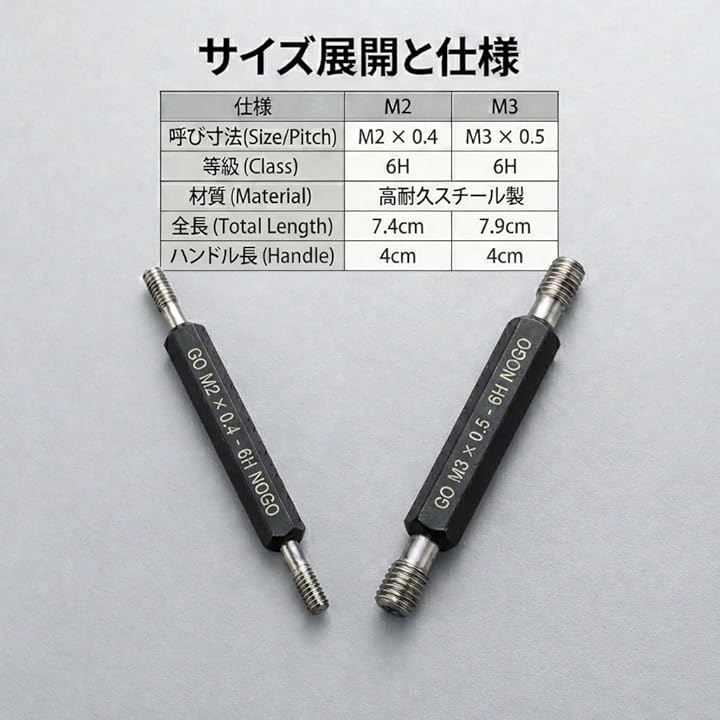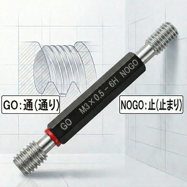 「合否判定」 ネジ穴の精度を素早くチェックできる、通り(GO)と止まり(NOGO)が一体となったプラグゲージです。