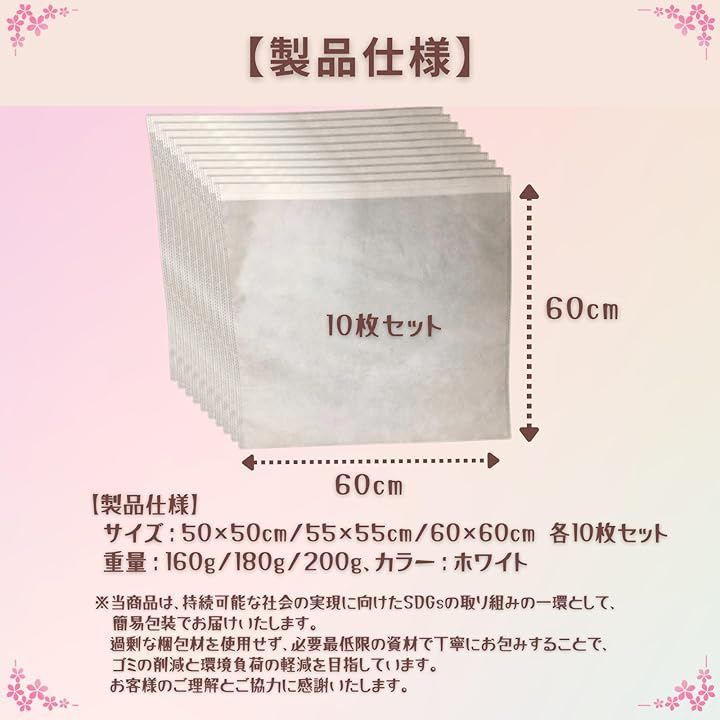 「製品仕様」 サイズ:50x50cm(10枚セット)/55x55cm(10枚セット)/60x60cm(10枚セット) 重量:160g/180g/200g、カラー:ホワイト *当商品は、持続可能な社会の実現に向けたSDGsの取り組みの一環として、簡易包装でお届けいたします。