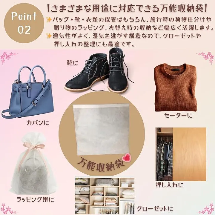 「さまざまな用途に対応できる万能収納袋」 バッグ・靴・衣類の保管はもちろん、旅行時の荷物仕分けや贈り物のラッピング、衣替え時の収納など幅広く活躍します。