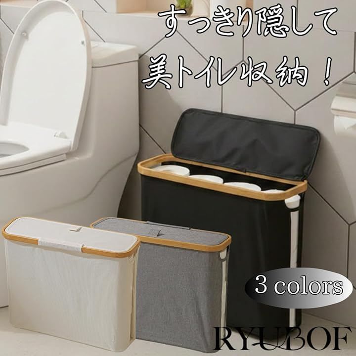 Ryubof トイレットペーパー 収納 蓋付き ストッカー ケース スリム 12ロール収納 トイレ収納ボックス 北欧風 おしゃれ トイレットペーパー置き すき間収納 26L 大容量 (ブラック, ワンサイズ)