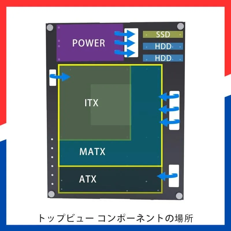 【ATX/MATX/ITX 対応】 ATX、MicroATX、Mini-ITXマザーボードに対応し、多様な組み合わせや拡張構成が可能。電源ユニットやGPUの取り付けも柔軟に対応します。