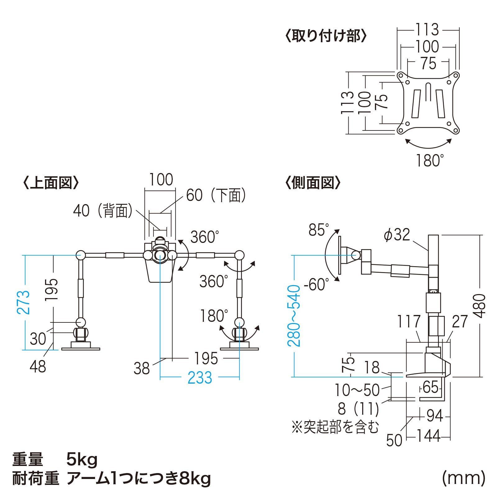 2面モニタ搭載可能。水平多関節モニタアーム。