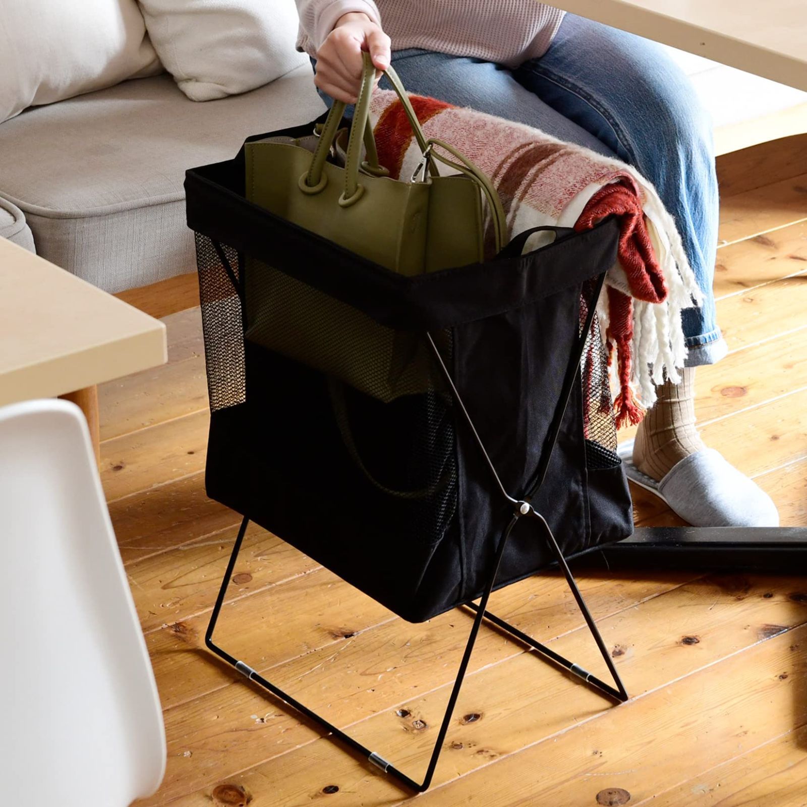 【床に直接置かずに済む】 手荷物収納バスケットを使えば、手荷物を床に直置きせずに済むので、清潔に収納できます。オフィスのデスク下の荷物置きにもオススメです。