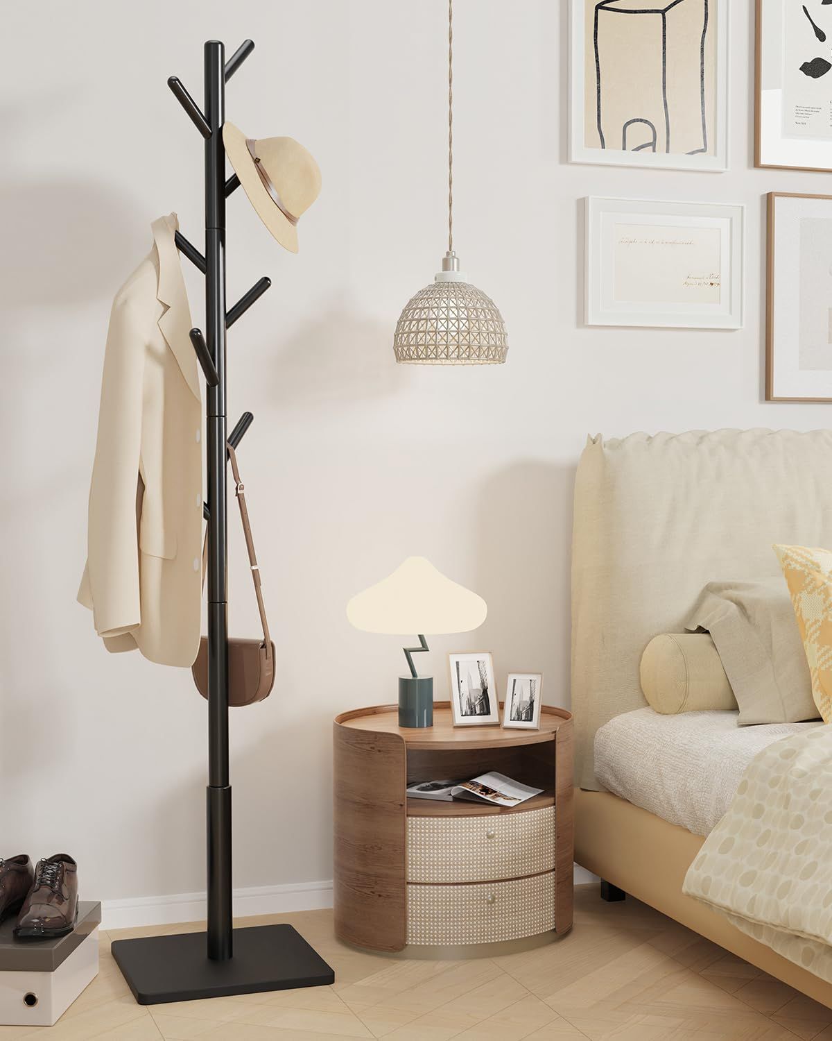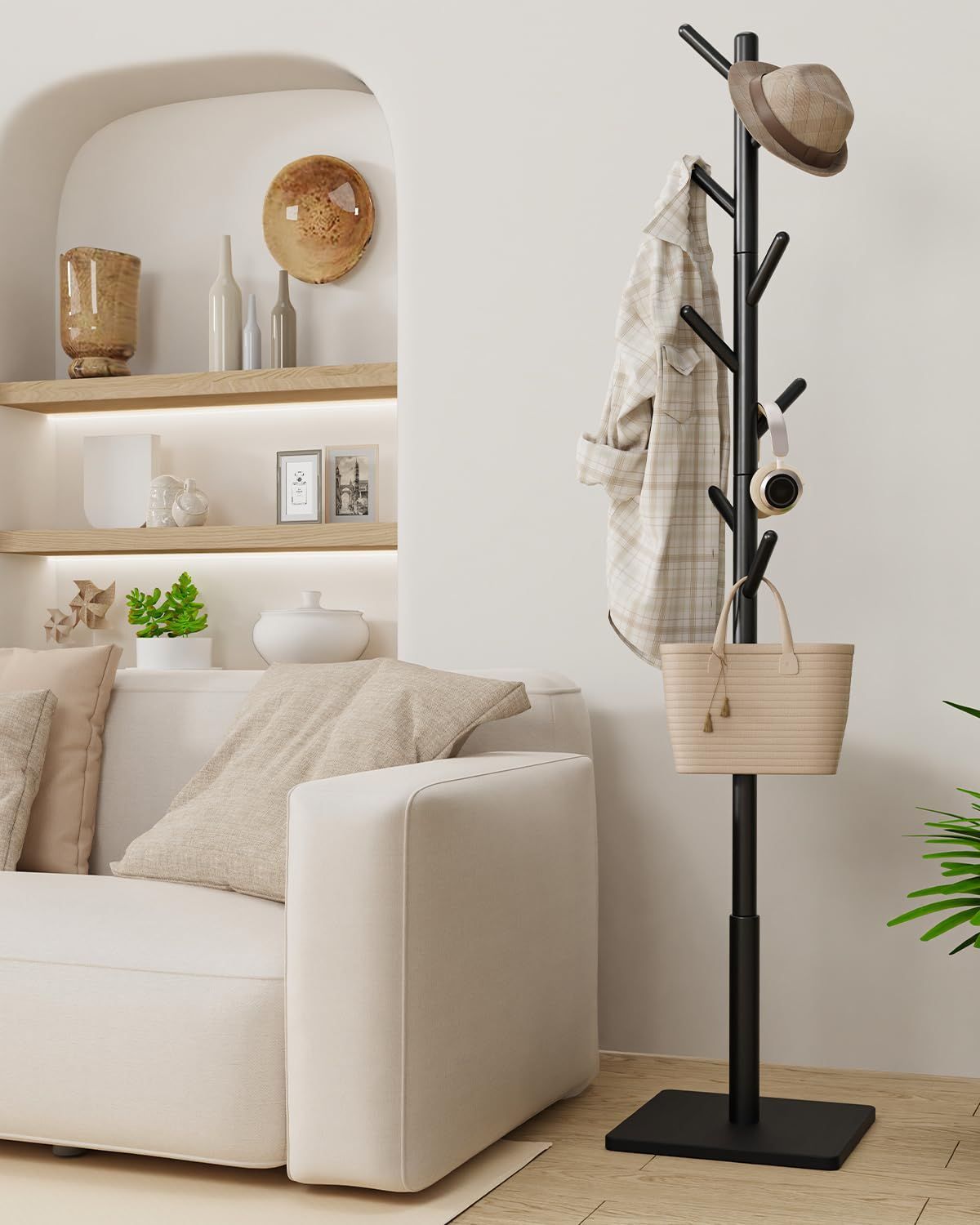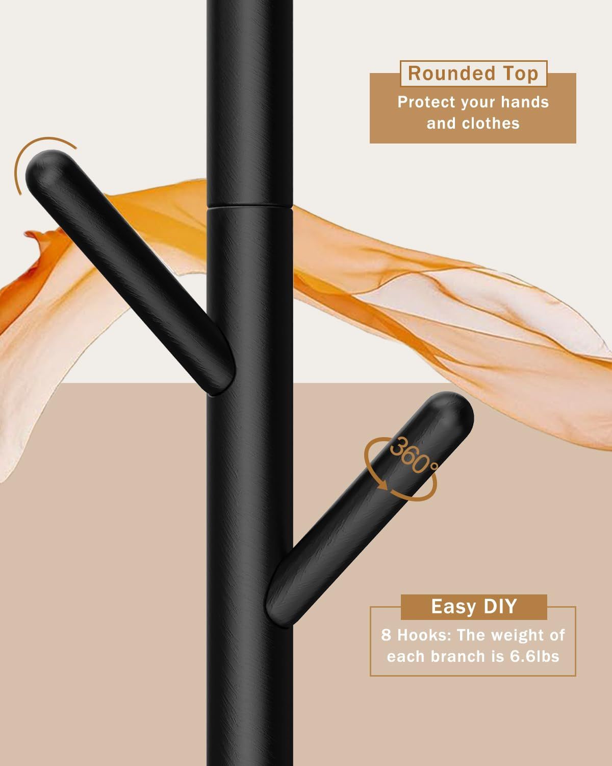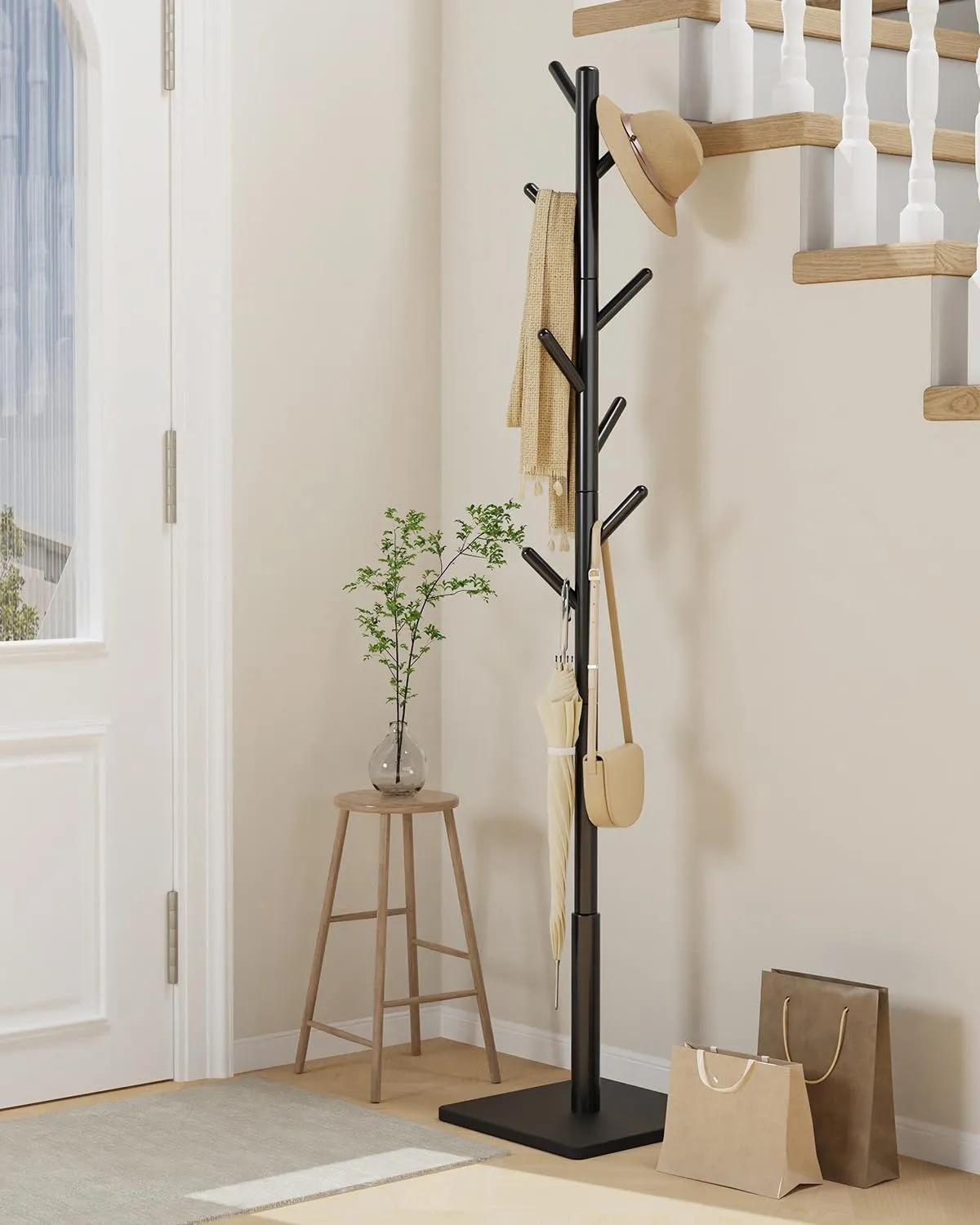Yawinhe ポールハンガー 8つのフックがついたハンガーラック 3段高さ調節可能 高耐荷重 頑丈な四角の台座四角滑り止め付きです ,です木製 コートハンガー 高さ180CM省スペース 収納力があります 適用されます リビング 寝室 帽子 衣服,(ブラック)