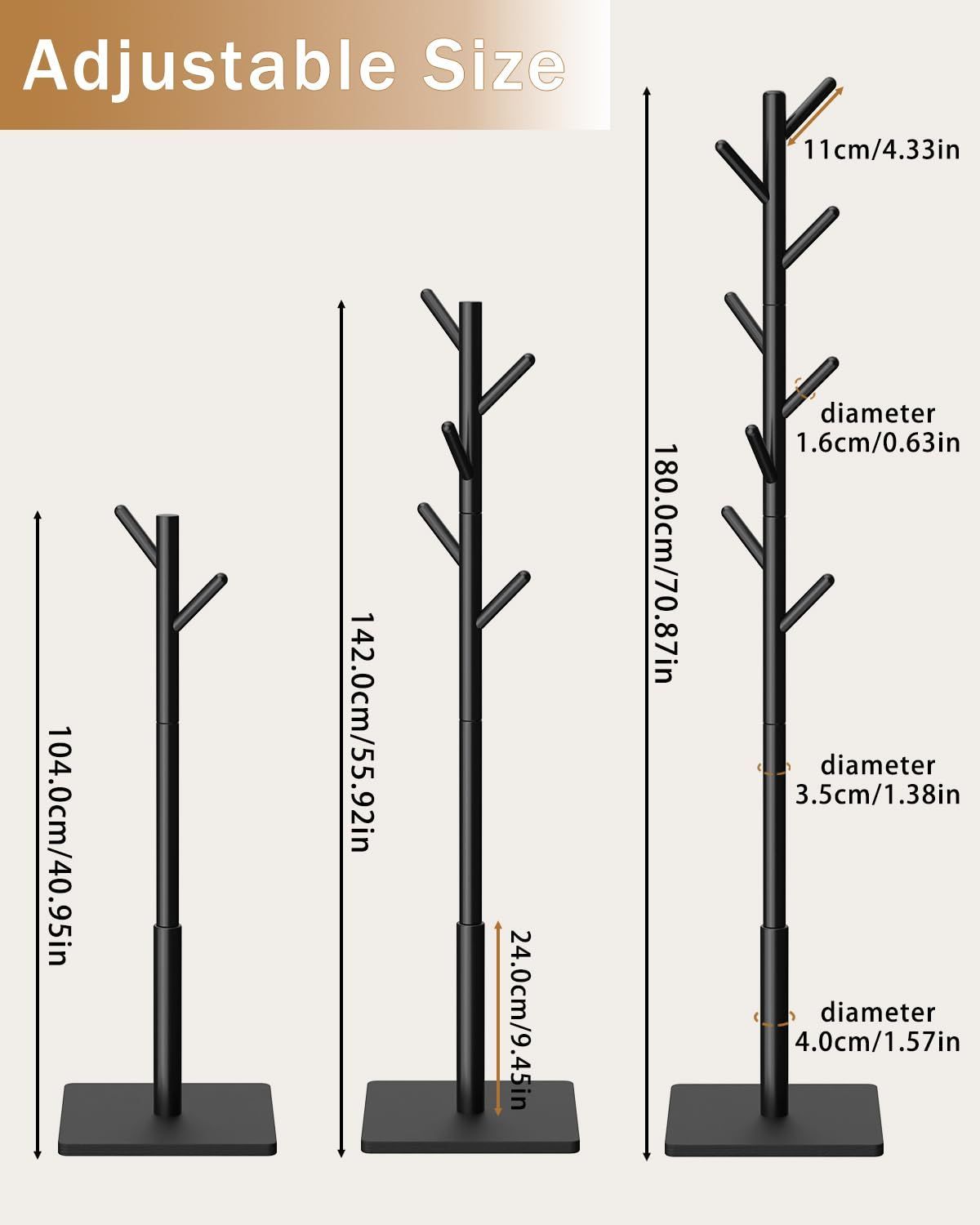 調節可能な高さ:4本のメインロッドが異なる組み立てオプションを提供します,ご家族のニーズに合わせて洋服ラックの高さをカスタマイズできます,お子様用に 2 ~ 3 セクション、大人用に 4 セクションを使用できます,このハンガーラック、104cm~180cmの前に高さを調整できます。
