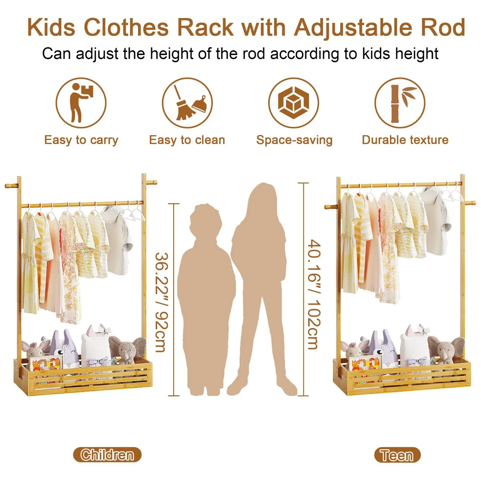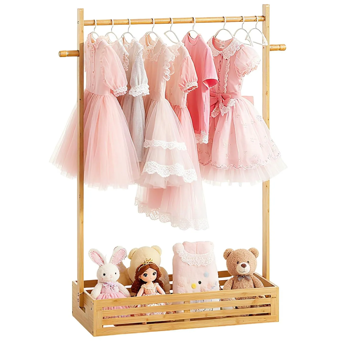 キッズ ハンガーラック 子供用 収納ボックス付き 調節可能ハンガー 省スペース 衣類収納 竹製 かわいい 洋服 おもちゃ キッズ服 ベビー 犬 猫 ペット服 衣類収納 洋服ラック 子供部屋 組み立て簡単 (キッズ用)