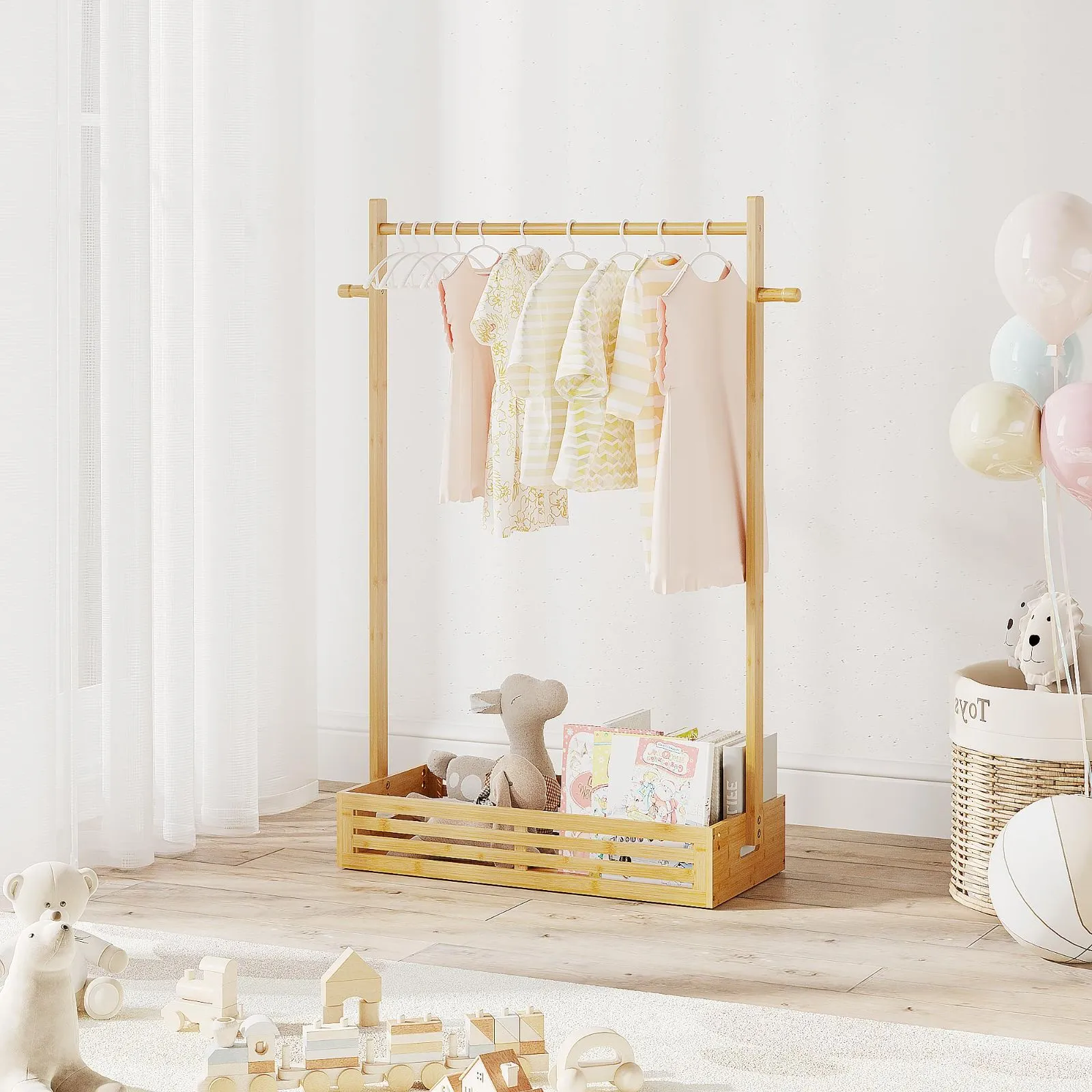 【多機能クローゼットラック】収納ボックス付きのこの子供ハンガーラックは、4歳から12歳のお子様に最適な高さに設計されています。幼児室、ナーサリー、子供部屋はもちろん、ベビー・キッズ服店のディスプレイラックなど、あらゆる場所で活用可能。お子様の洋服、ベビー服、ペットウェア、人形の衣装を素敵に展示できます。