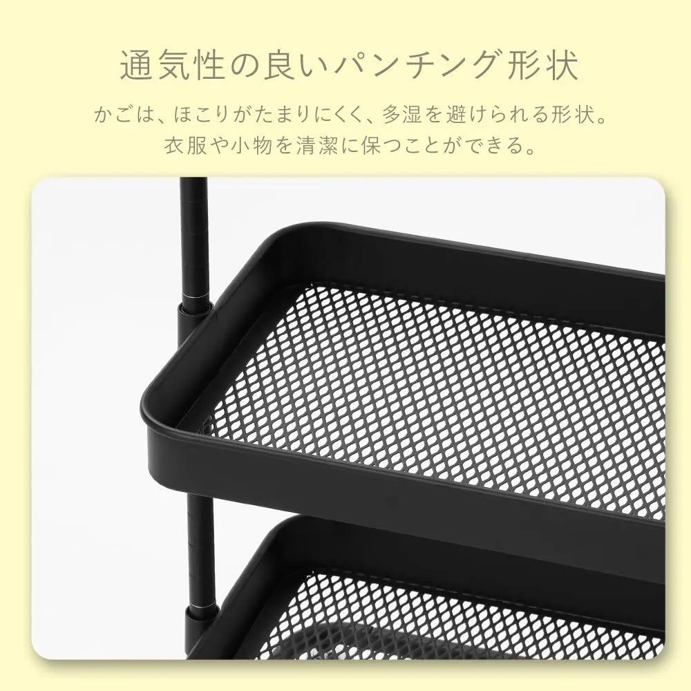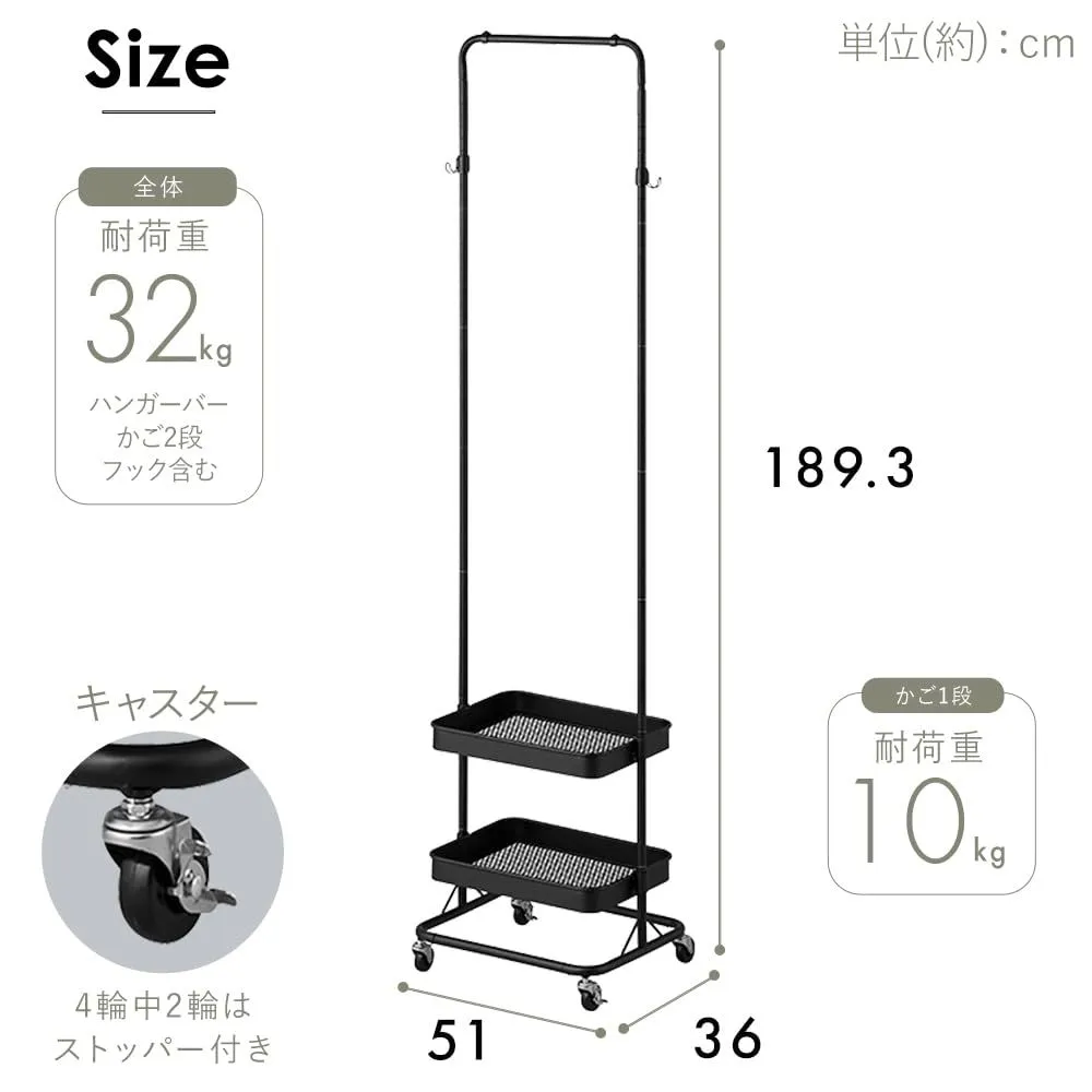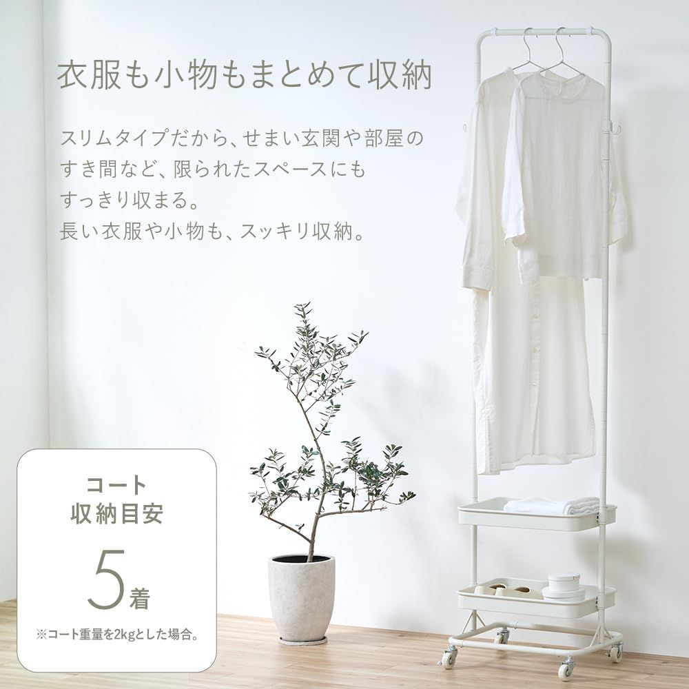 ◆衣服も小物もまとめて収納 しっかり高さがあるので、長い衣服でも安心。 コート収納目安:5着 ※コート重量を2kgとした場合。 かご付きなので、小物やラックだけでは収まりきらないアイテムもスッキリ収納。