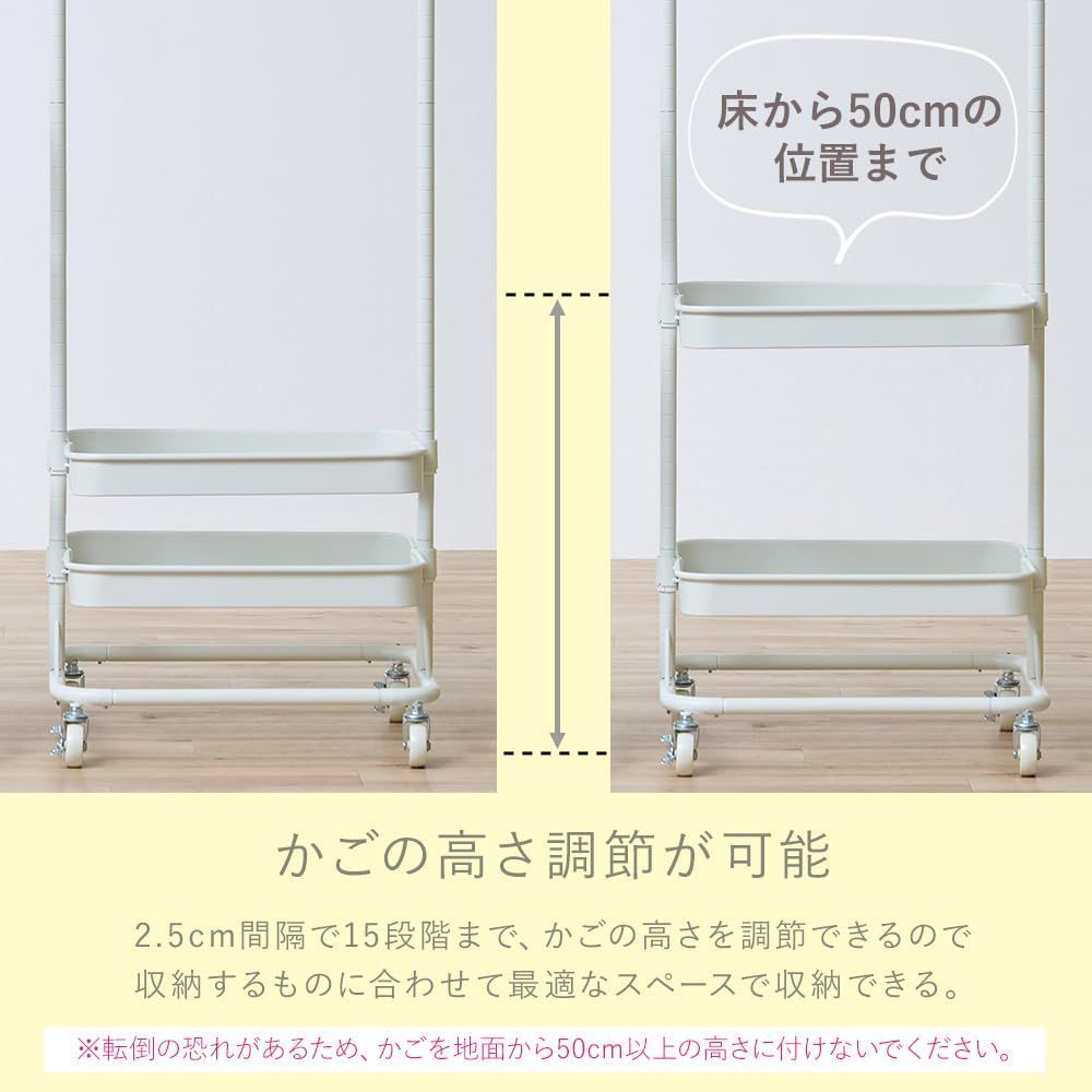 ◆かごの高さ調節 2.5cm間隔でかごの高さを調節できるので、収納するものに合わせて最適なスペースで収納できる。 ※転倒の恐れがあるため、かごを地面から50cm以上の高さに付けないでください。