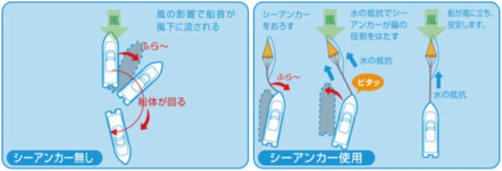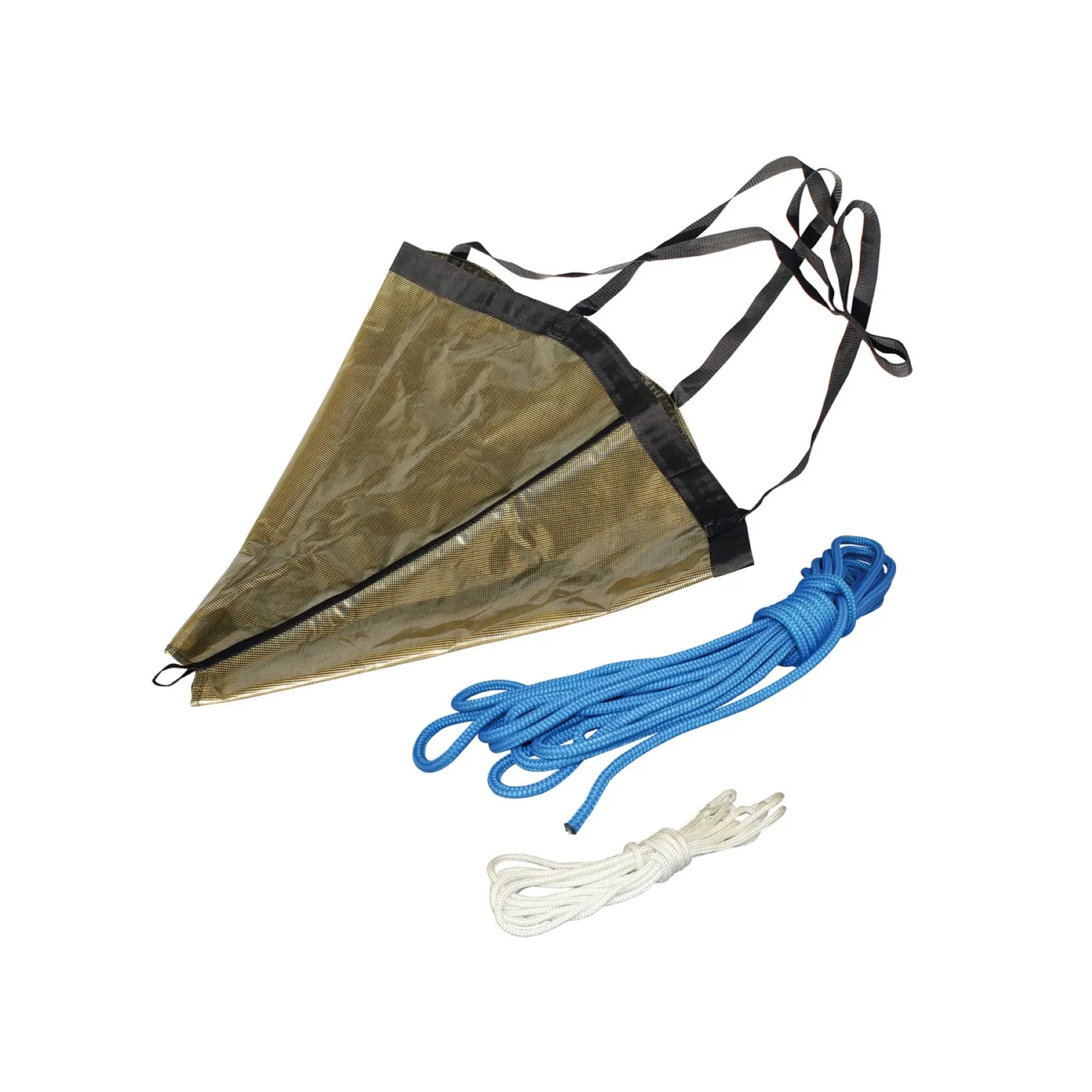 強風時に船が速く流れるのを軽減できます。シーアンカーを船首方向から投入することにより、風に船首を立てて船が流れるスピードを軽減できます。生地は丈夫で厚手のPVC製のリップストップ生地を採用しています。すぐに使用できるようにロープセットのパッケージです。