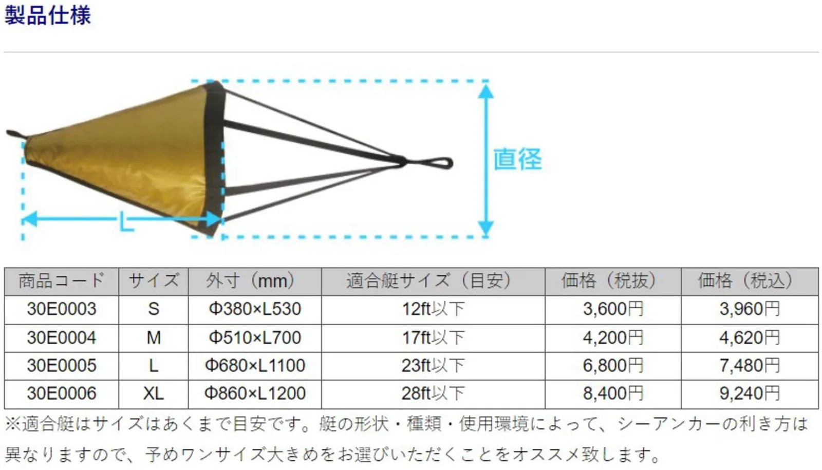 ※適合艇サイズはあくまでも目安です。艇の形状・種類・使用環境によって、シーアンカーの効き方は異なります。サイズに不安がある場合は、あらかじめ1サイズ大きめをお選びいただくことをおすすめいたします。