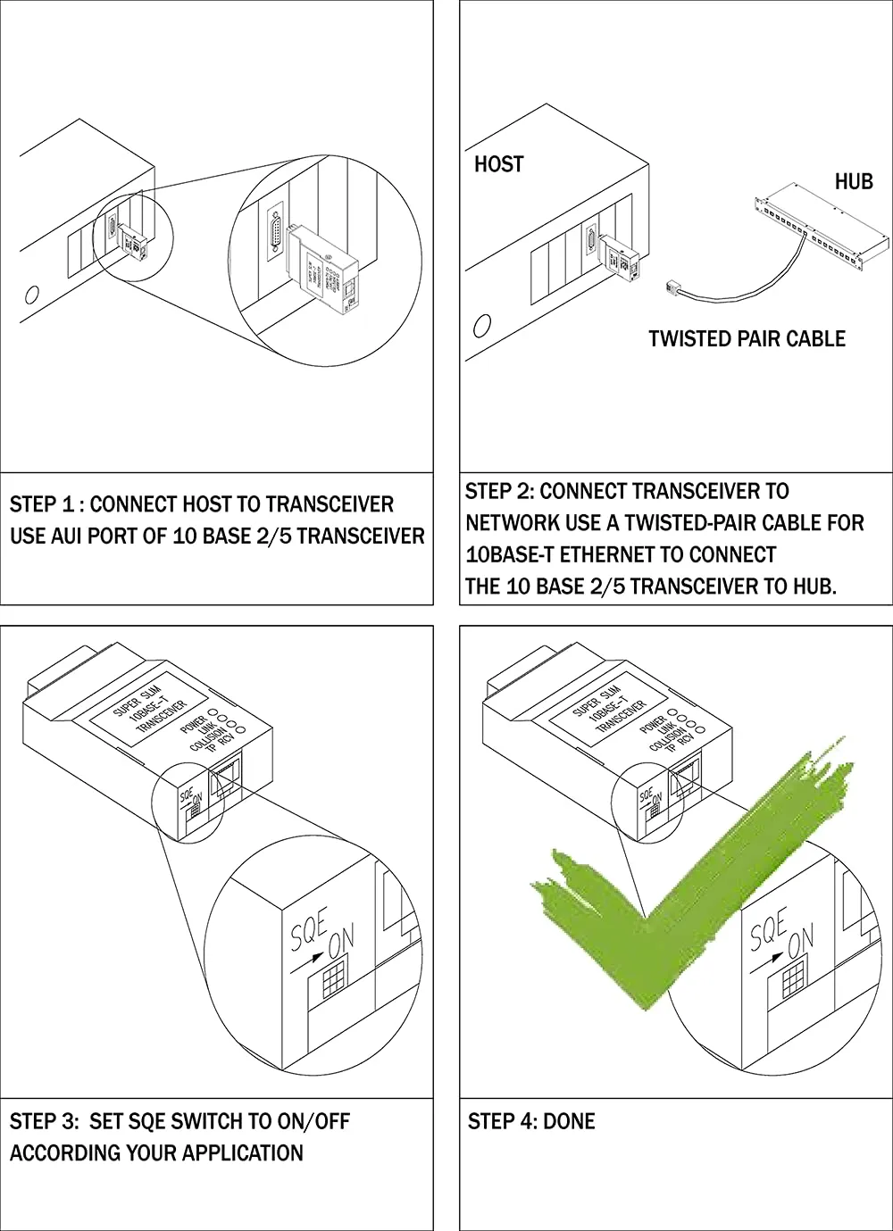 AN-10BT-10B5メディアコンバーター/トランシーバーは、DB15M/AUIコネクタを介して10Base-5信号を10Base-Tイーサネット用の標準RJ45プラグに変換し、シールドなしツイストペアケーブルを介して伝送します。 AN-10BT-10B5コンバーターは、AUIコネクタとRJ-45ジャックの両方を提供し、シックイーサネットホストから10BASE-Tイーサネットネットワークへの直接接続を容易にします。 ホストは厚みのあるイーサネットカード、または10Base-5リピーターです。 SKE機能スイッチは、信号品質エラー機能を有効にするために使用されます。 この信号は、トランシーバーの衝突検出回路が動作していることを検証します。 トランシーバーが接続されているホストがコンピューターの場合は、SKEスイッチをONに設定します。 ホストがリピーター(同軸ケーブル使用)の場合は、SKEスイッチをOFFに設定します。