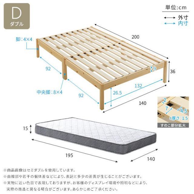 【商品サイズ】 ベッドD:(約)幅140×奥行200×高さ36cm マットレスD:(約)幅140×奥行195×高さ15cm(コイル数:392個)