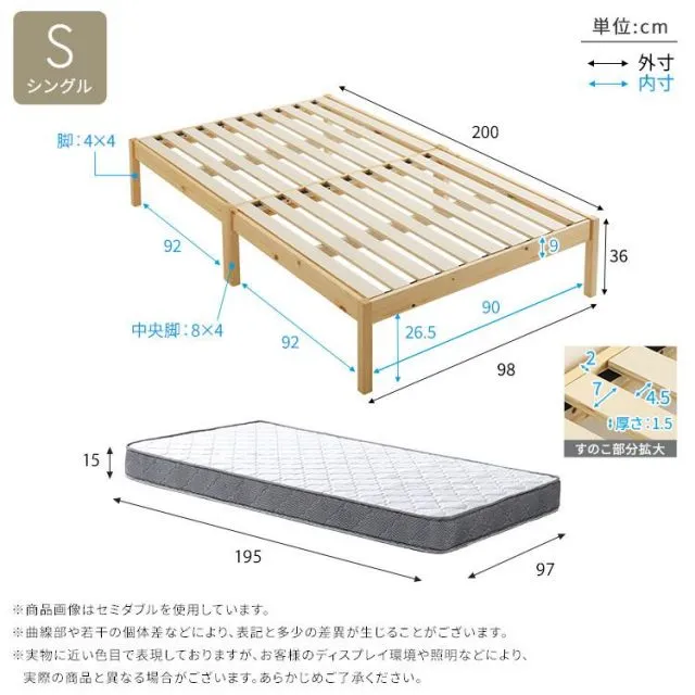 【商品サイズ】 ベッドS:(約)幅98×奥行200×高さ36cm マットレスS:(約)幅97×奥行195×高さ15cm(コイル数:308個)