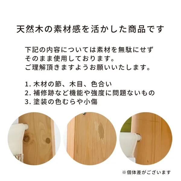 【天然素材を活かした商品について】 当商品は天然素材の風合いを活かした商品です。 下記については、天然素材を無駄にしないためそのまま使用しており、 機能上問題のないものは不具合品とはなりませんので ご理解いただきますようお願いいたします。 ・木材の節、木目、色合い ・補修跡など機能や強度に問題のないもの ・塗装の色むらや小傷 出荷 3営業日以内 サイズ・容量