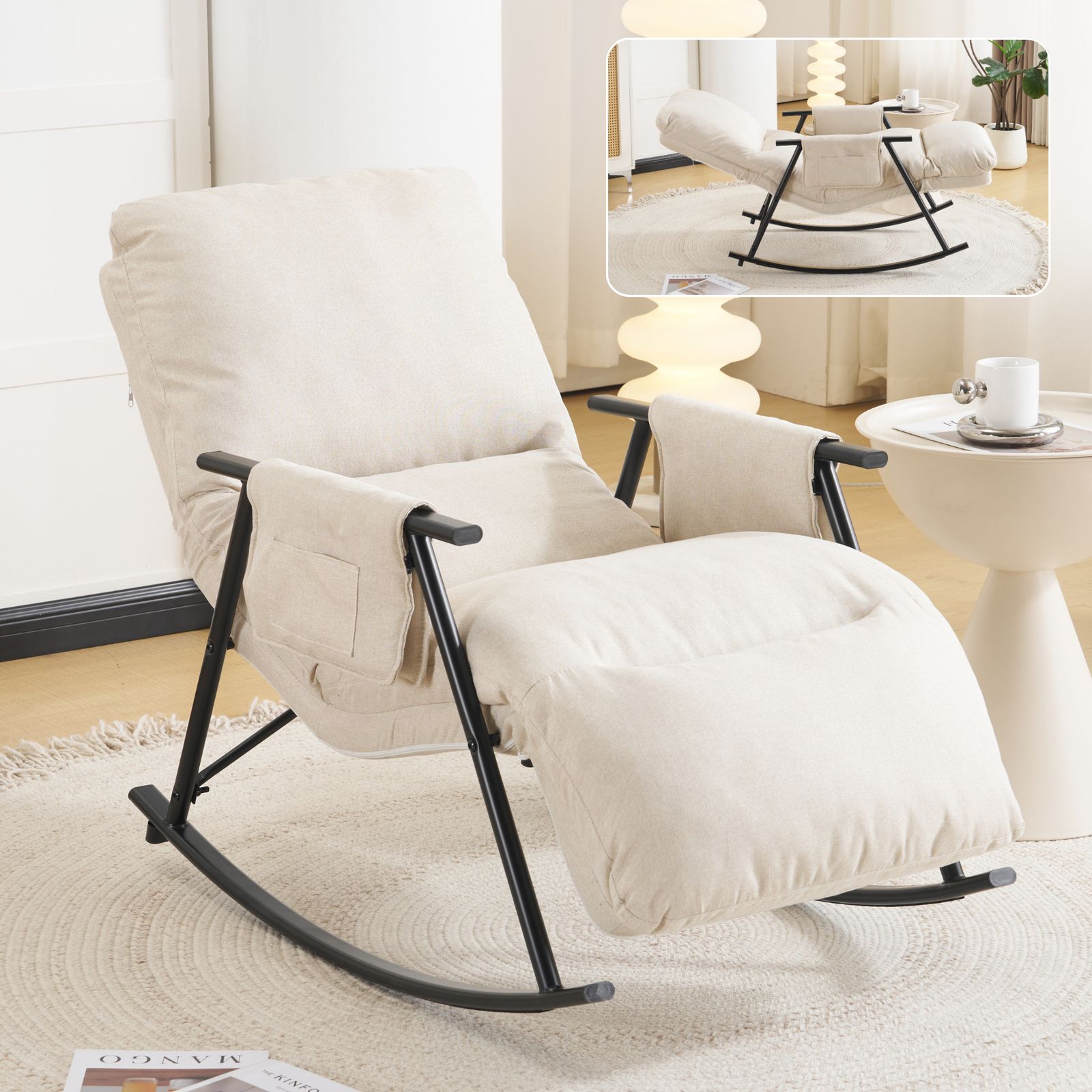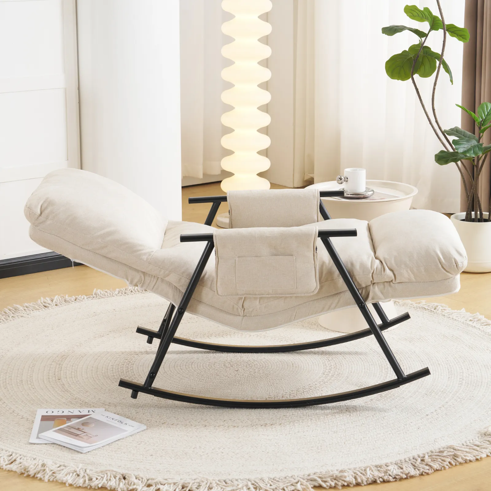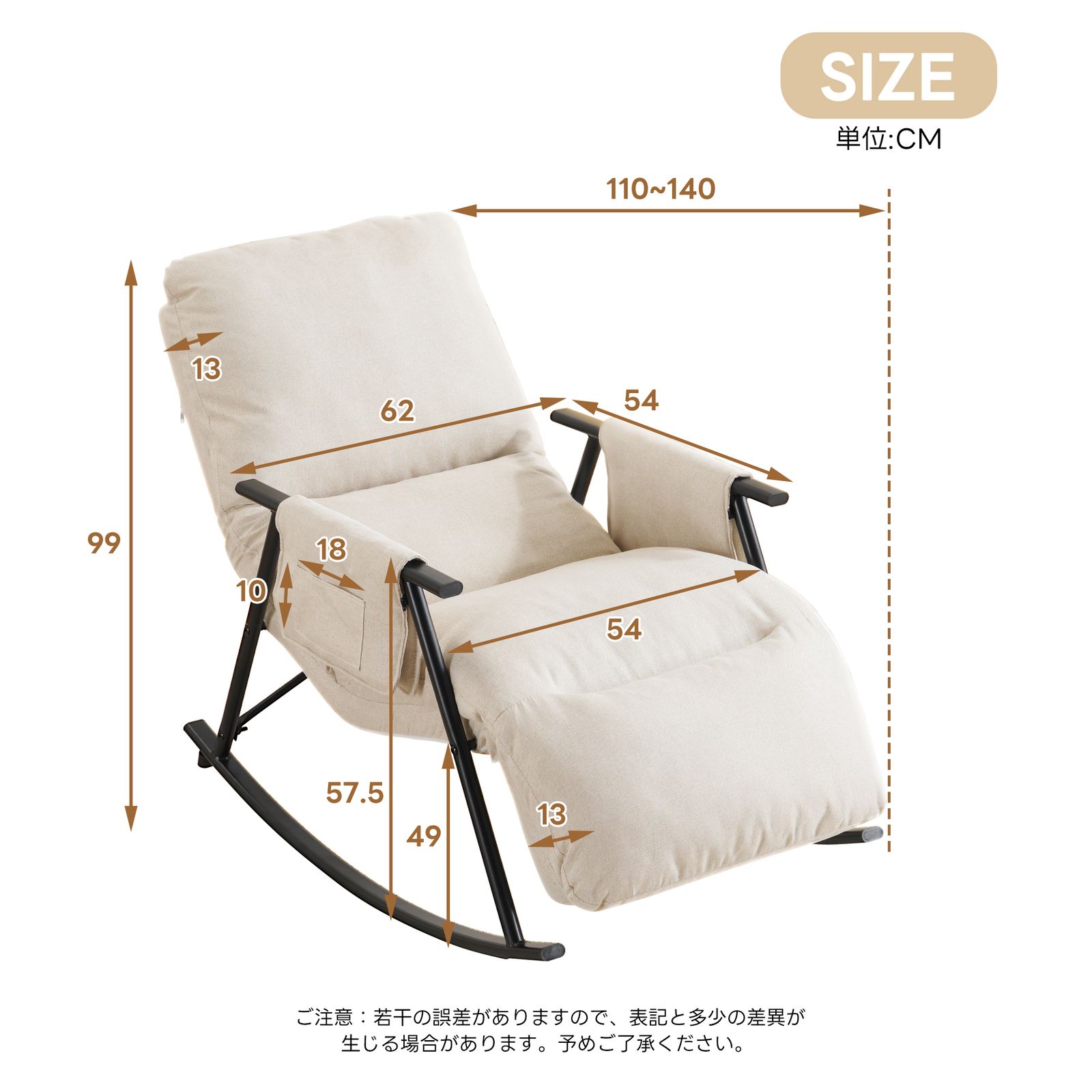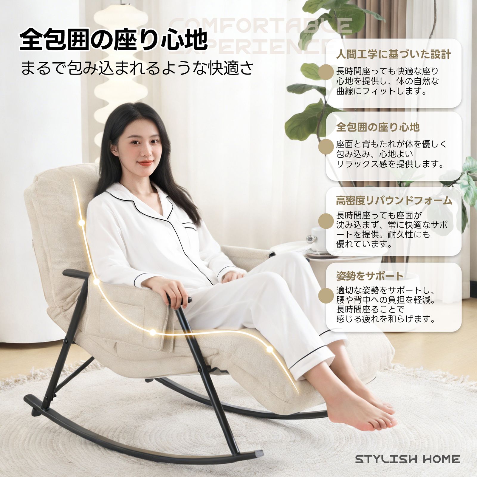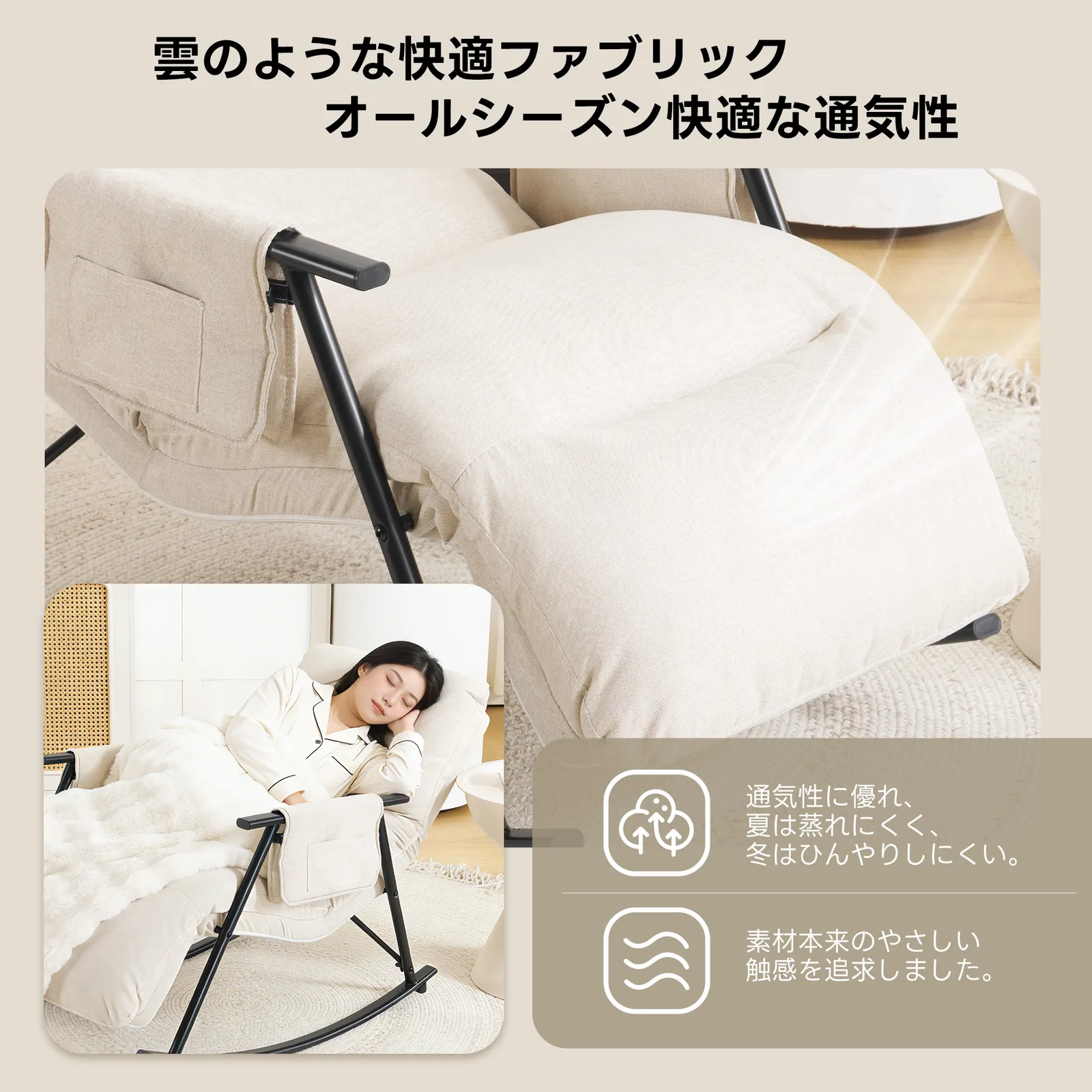 【多シーンでの快適さ(機能性)】角度調整可能:ロッキングチェア / リクライニングチェアの多段階切り替えに対応,「ゆっくりゆれる」「半横になってリラックス」「ドラマ観賞用の座り」など、さまざまな自宅でのシーンに対応可能。フットレスト一体型デザイン:別途フットレストを用意する必要がなく、座ったら自然に足を置ける。足元がしっかりサポートされ、長時間座っても疲れにくい。