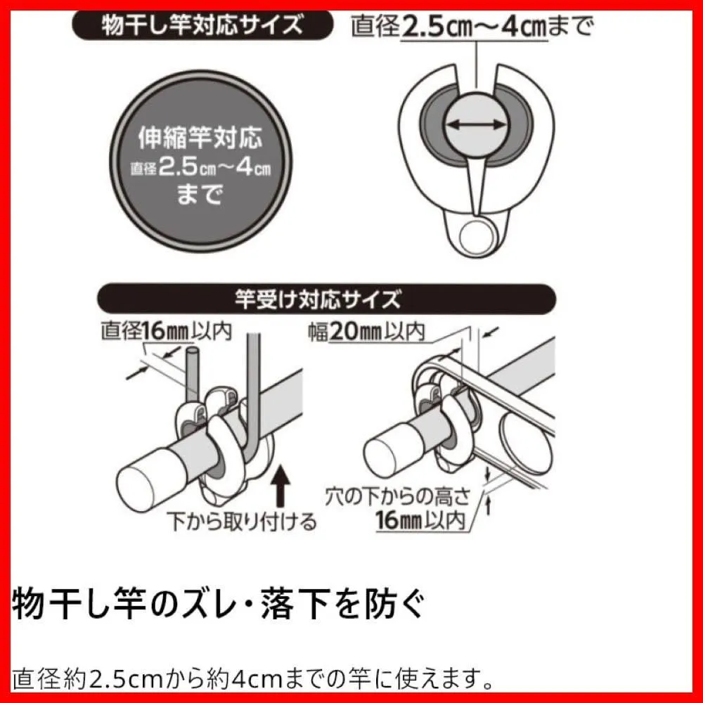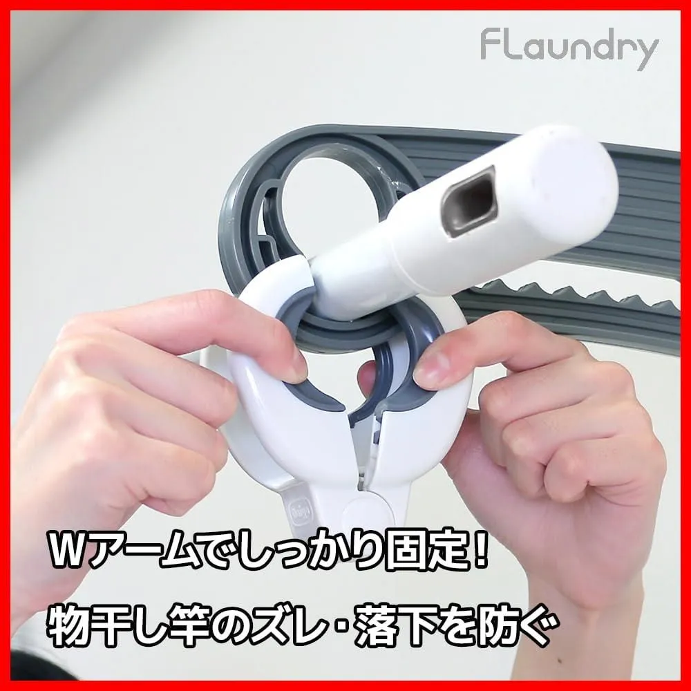 ●物干し竿と竿受け両方を一度で挟めるWアーム形状でしっかり固定し、上下左右のズレ・落下を防ぐことができます。