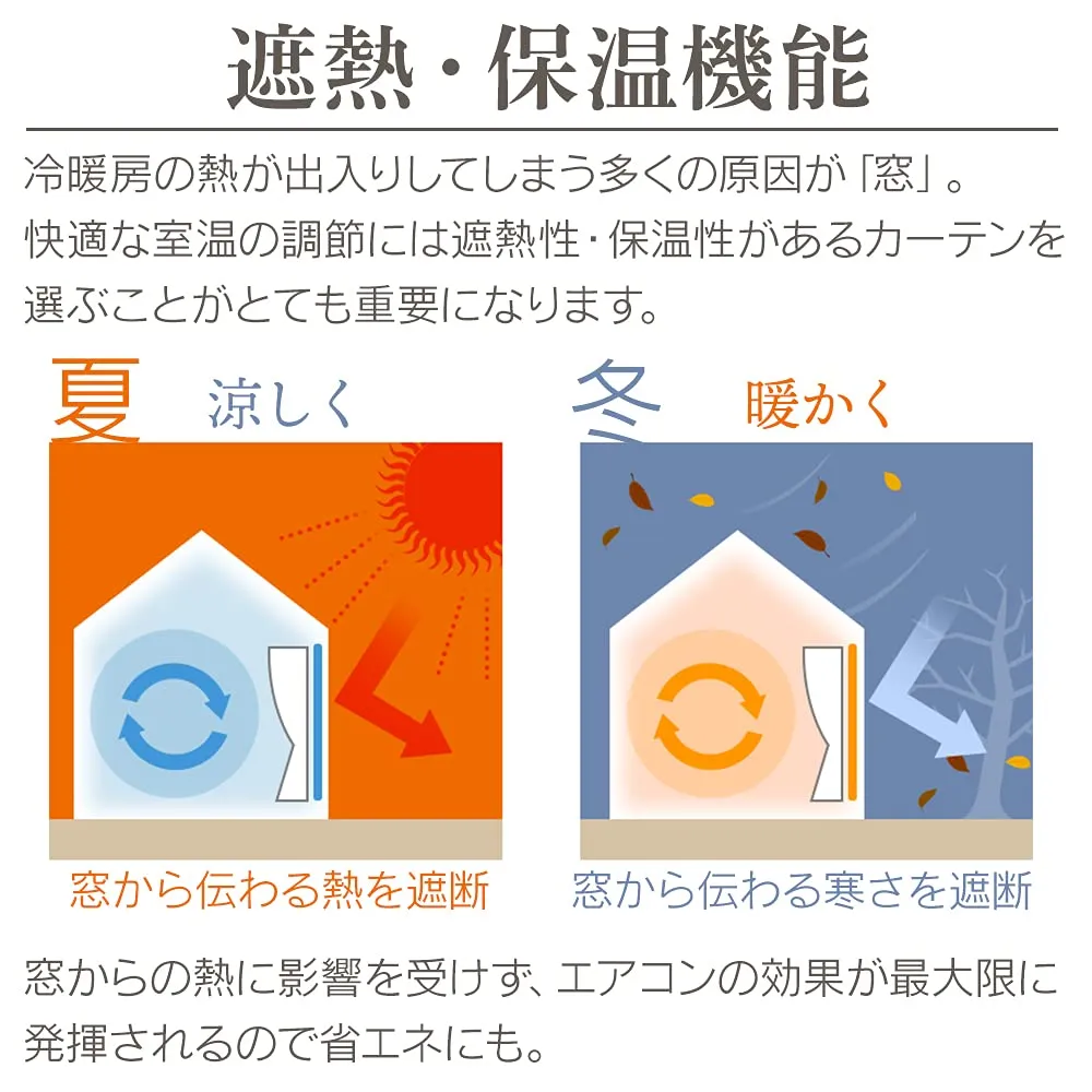 機能:1級遮光、遮熱効果率 19%、保温効果率 33%、ウォッシャブル