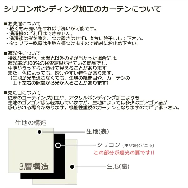 【こちらのサイズには巾継ぎが入ります。巾継ぎ部分から光が漏れる場合があります】遮光等級:一級遮光(遮光率100%・完全遮光) 遮光率はカーテン生地に対する試験ですので、実際にカーテンとして使う場合、お部屋をかなり暗くするためには両サイドや上下部分も十分に覆うなどの工夫が必要です。驚異の遮光率100%!「シリコンボンディング」という、生地と生地の間にシリコンを挟み込み接着する加工を施し生地の風合いを生かしたままで物理的に空気を遮断、機能や効果をアップ。生地(表・裏)はシンプルな完全無地の生地です。シリコンボンディング加工によって、従来の加工生地(コーディングやボンディング)にあった手触りのゴワゴワ感を極限まで減らした風合いを実現しました。とても軽い生地の為、つっぱりポールにリングランナーを使用してカーテンを掛けたい場合なども気軽に設置することができます。表も裏も全く同じ生地なので、間仕切りにもおすすめです。商品画像は巾100×高さ178cm2枚組の写真です。カーテンレールは付属しません。