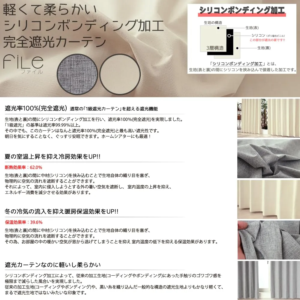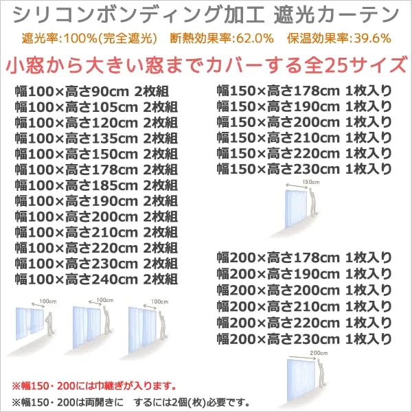 【こちらのサイズには巾継ぎが入ります。巾継ぎ部分から光が漏れる場合があります】 遮光等級:一級遮光(遮光率100%・完全遮光) 遮光率はカーテン生地に対する試験ですので、実際にカーテンとして使う場合、お部屋をかなり暗くするためには両サイドや上下部分も十分に覆うなどの工夫が必要です。 驚異の遮光率100%!「シリコンボンディング」という、生地と生地の間にシリコンを挟み込み接着する加工を施し生地の風合いを生かしたままで物理的に空気を遮断、機能や効果をアップ。生地(表・裏)はシンプルな完全無地の生地です。シリコンボンディング加工によって、従来の加工生地(コーディングやボンディング)にあった手触りのゴワゴワ感を極限まで減らした風合いを実現しました。とても軽い生地の為、つっぱりポールにリングランナーを使用してカーテンを掛けたい場合なども気軽に設置することができます。表も裏も全く同じ生地なので、間仕切りにもおすすめです。 商品画像は巾100×高さ178cm2枚組の写真です。カーテンレールは付属しません。