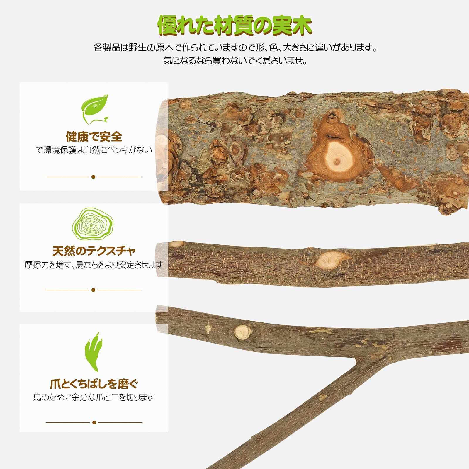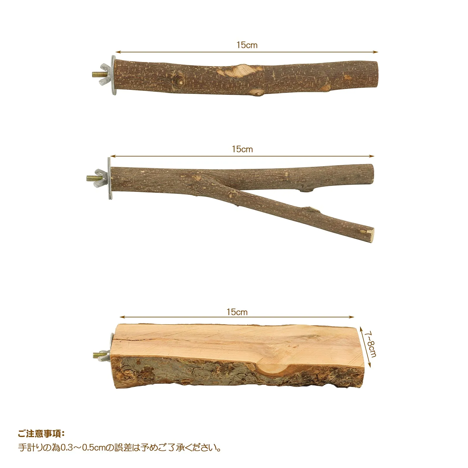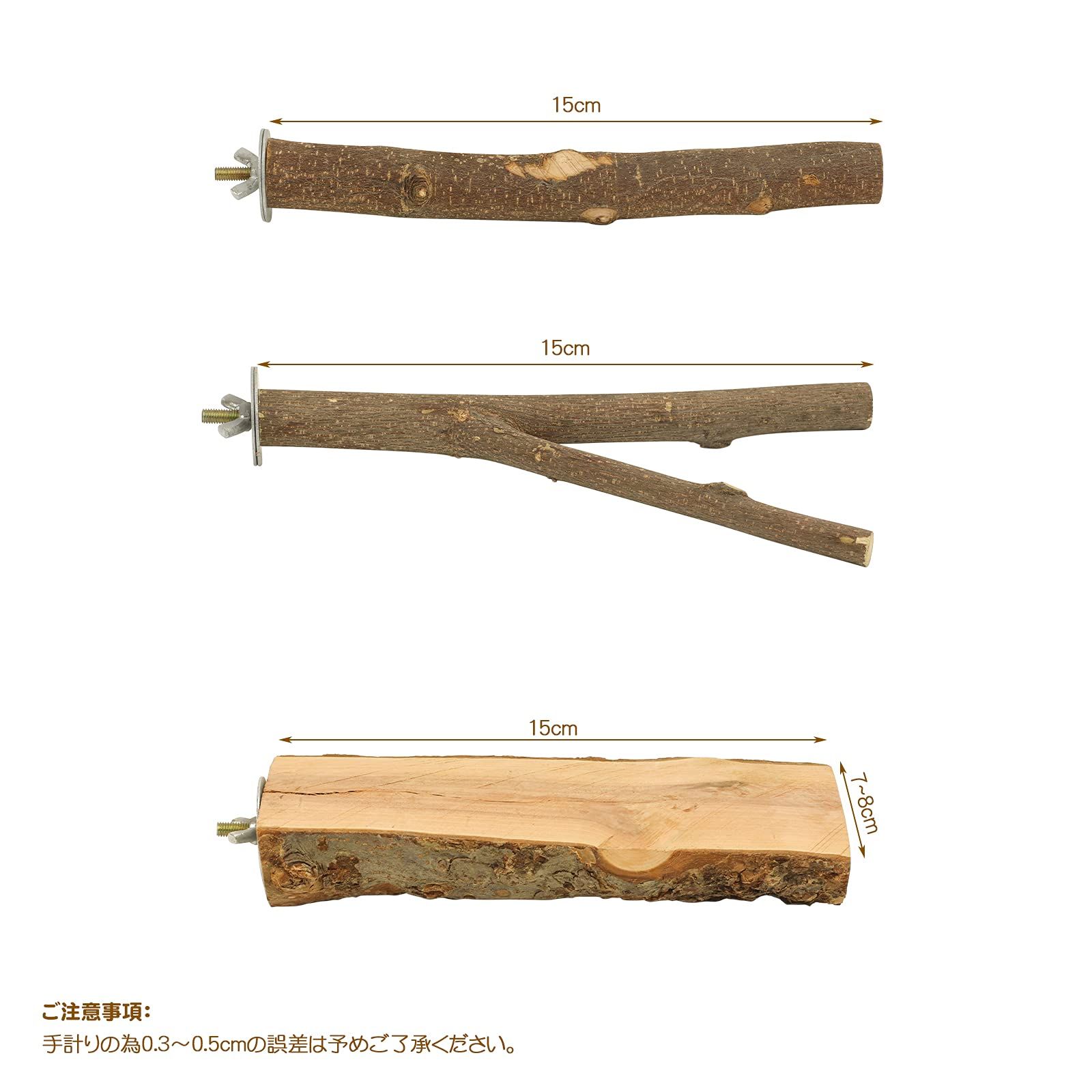 ?サイズ:止まり台:幅7-8cm、長さ15cm 止まり木:長さ15cm、枝の直径は1.5-2.5cm(太い部分)です。鳥の爪研ぎ棒:長さ15cm、枝の直径は1.5-2.5㎝です。