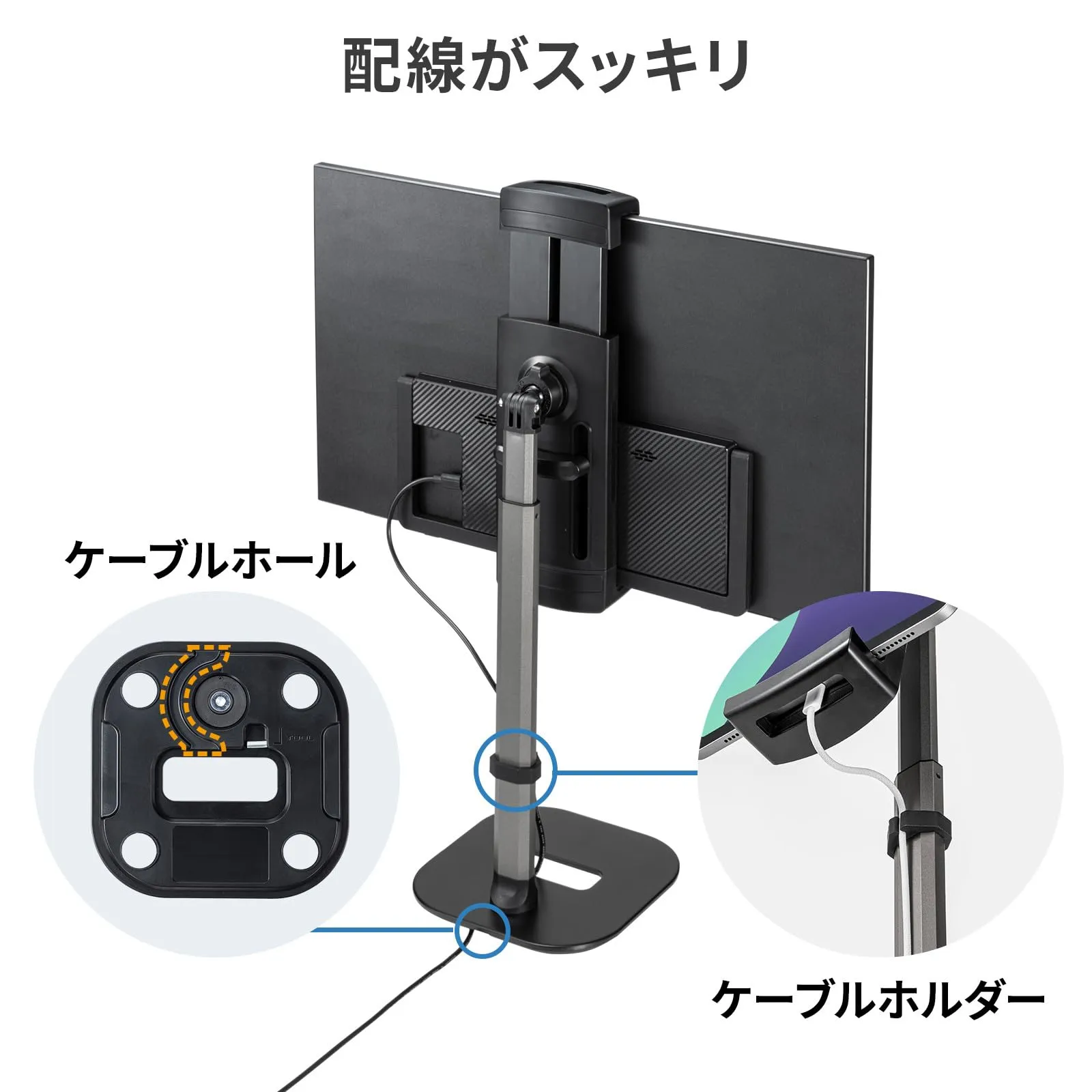 ●17.3インチまでのモバイルモニターやタブレットの取り付けに対応した、高さ調節ができるデスクトップスタンドです。(対応サイズ185~270mmまで)