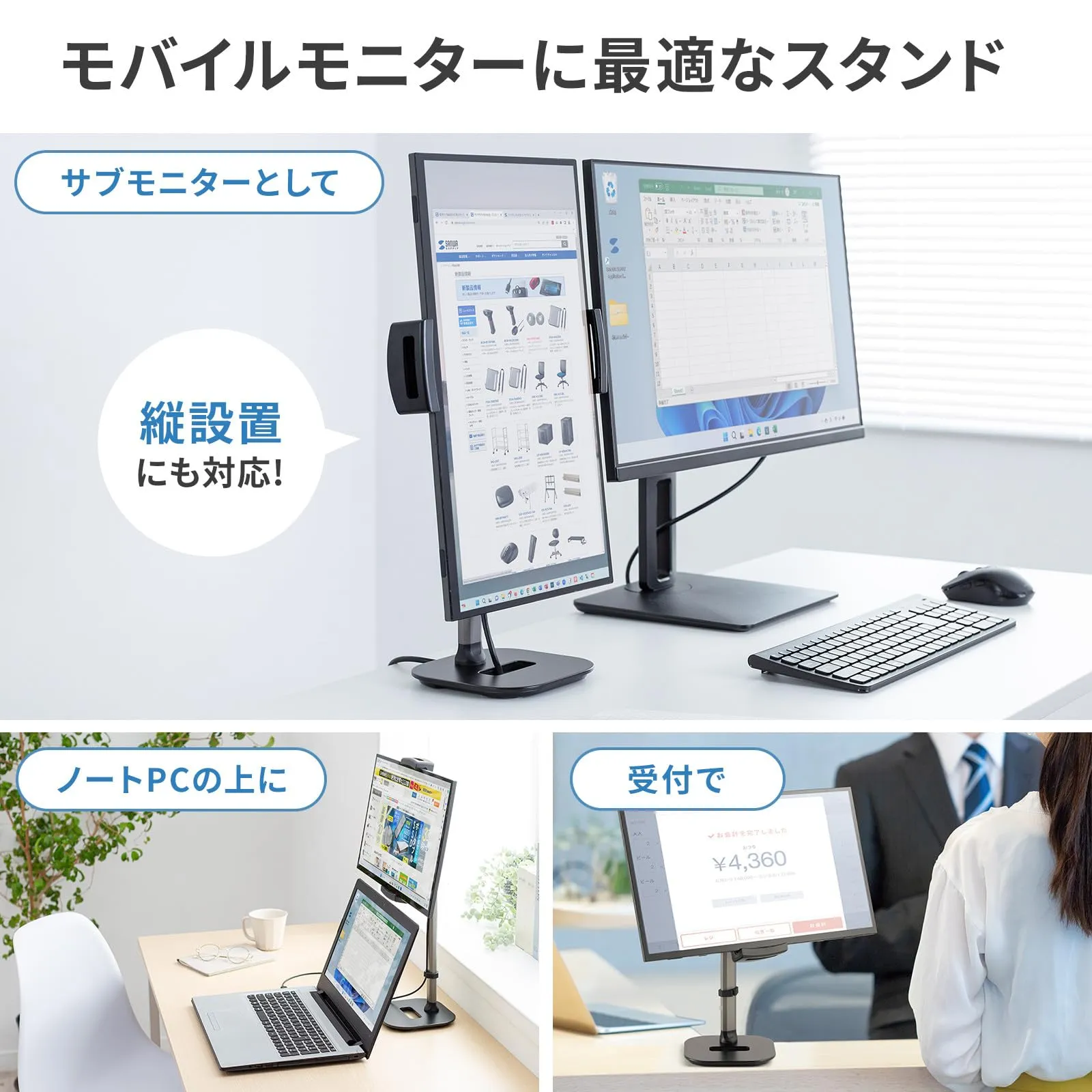 角度調節に対応し、設置機器を垂直にセットして使用することができるため、モバイルモニターの設置に最適です。