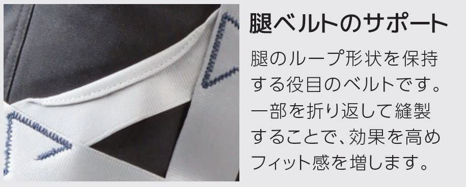 【腿ベルトの構造】フラットに配置された腿のベルト構造。束縛感が少なく、足を大きく開きやすい事や、そのシルエットから建設業ユーザーより支持を得ています。