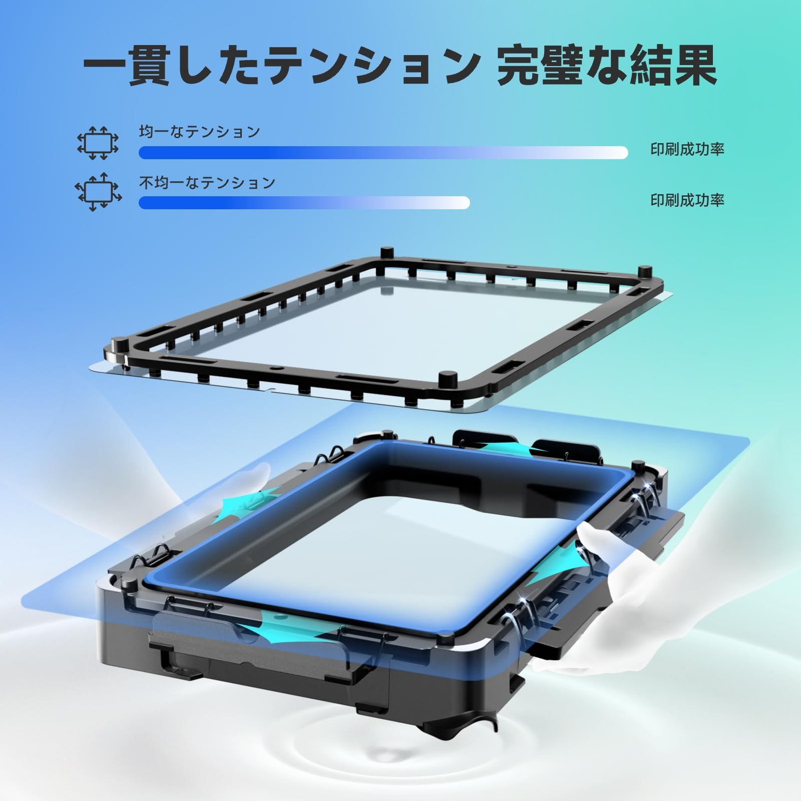 【安定したテンション】不均一なテンションは、印刷欠陥、レイヤーの一貫性のない接着、フィルムの早期摩耗につながります。当社のスナップオントレイを使用すれば、各面に一貫した圧力がかかり、完璧で完璧な印刷が可能です。