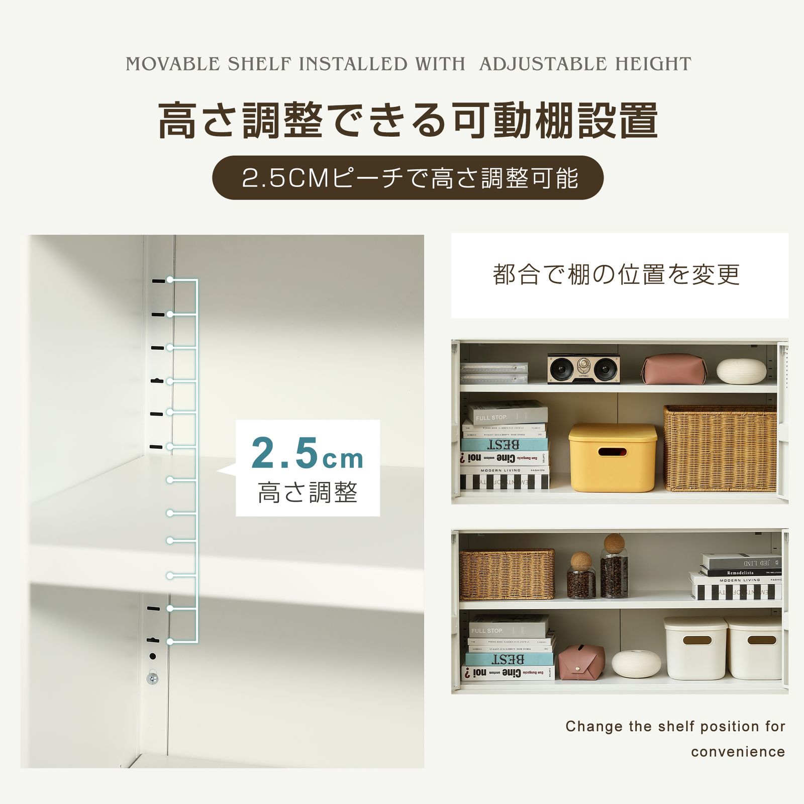 【棚板調節可能|収納物に合わせて自由自在】2調節可能な棚板設計で、本やファイルから大型アイテムまで柔軟に対応。季節ごとやライフスタイルの変化に合わせてレイアウト変更が可能です。