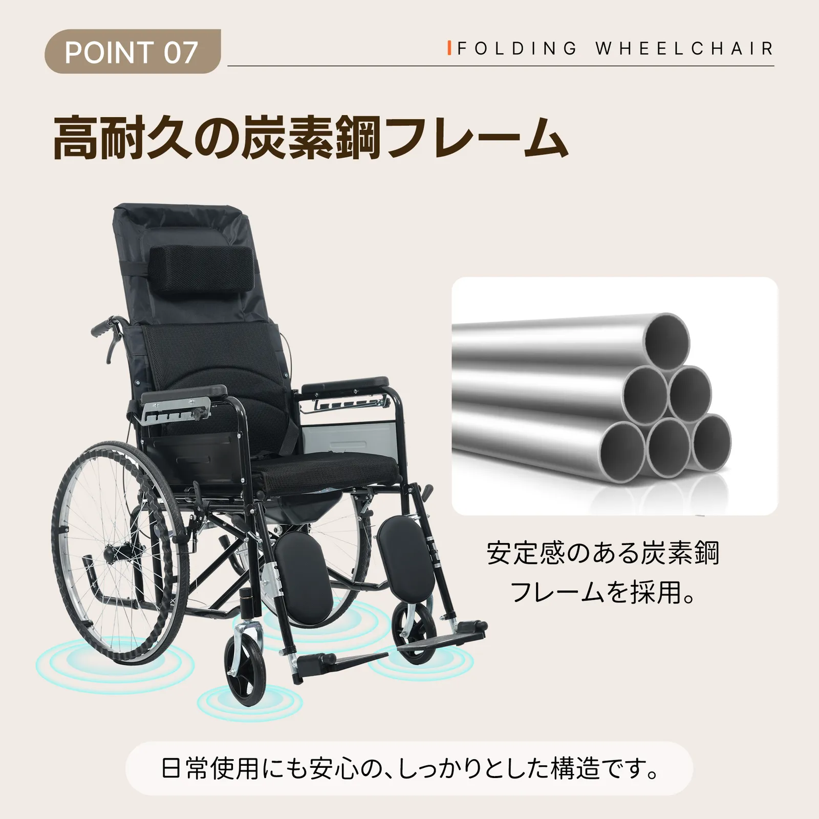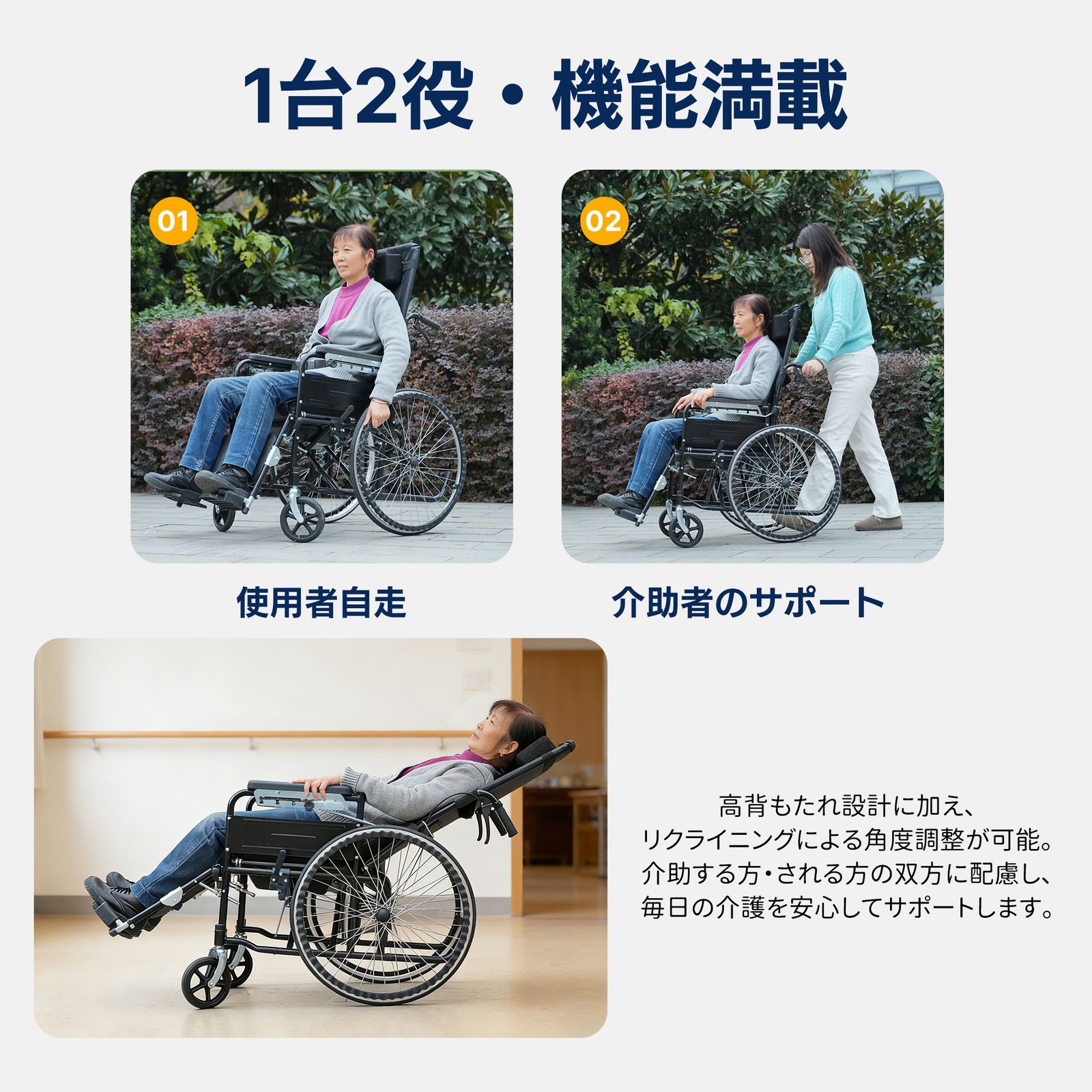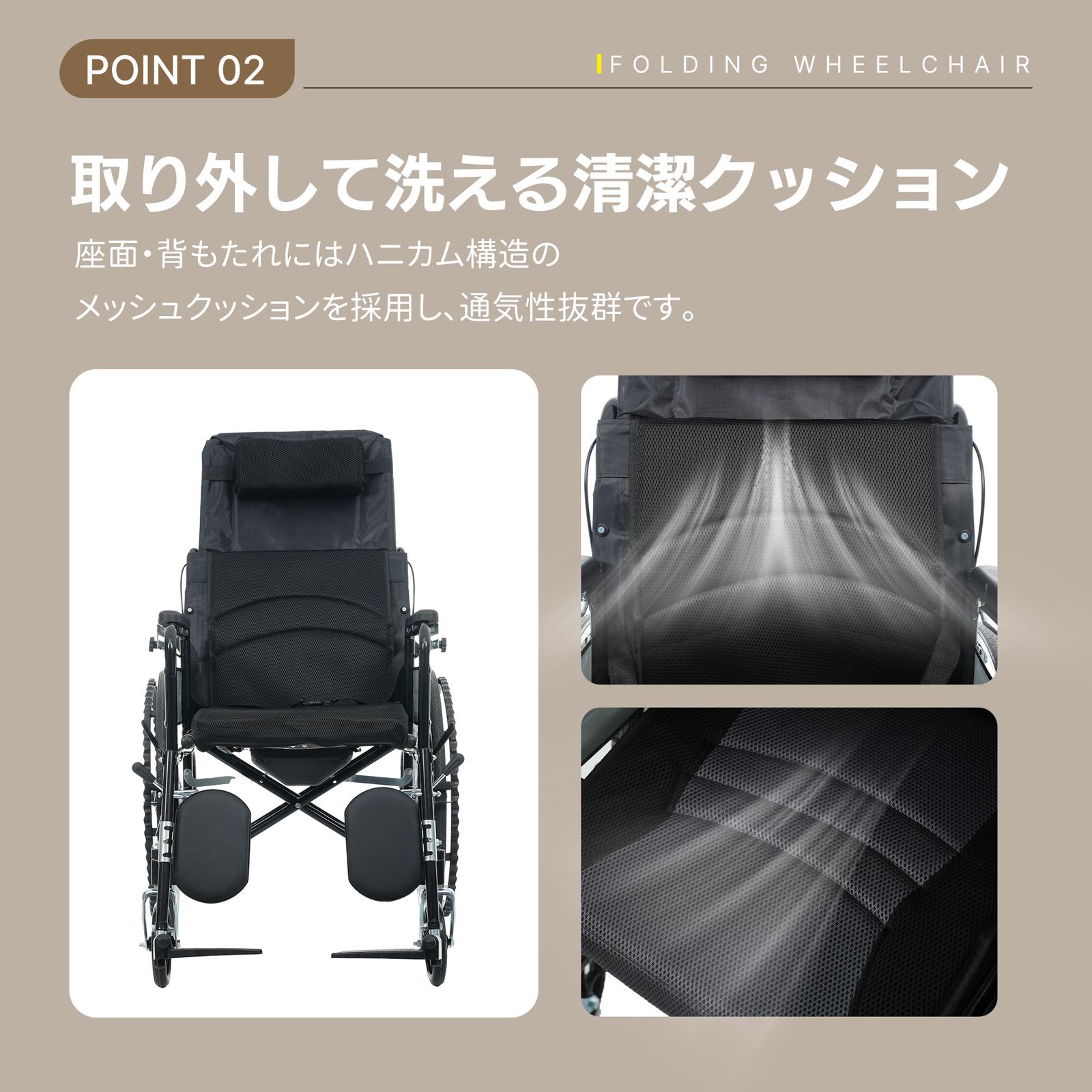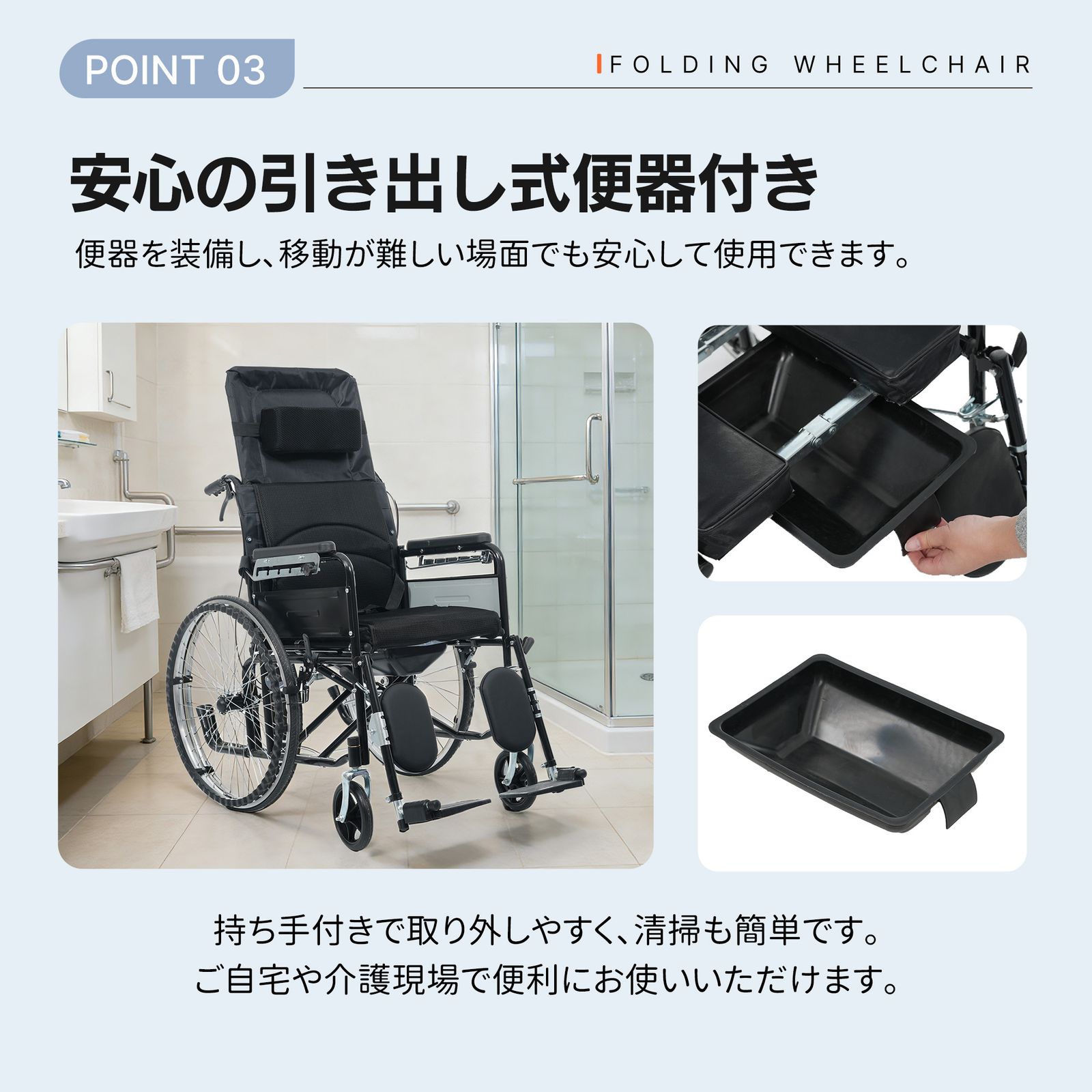 ・◎01日常の介護から外出・旅行まで、あらゆるシーンで快適に使える折りたたみ式リクライニング介護用車椅子(便器付き)。体への負担を抑えた設計で長時間の使用でも快適。介助する方・される方の双方に配慮し、毎日の介護を安心してサポートします。