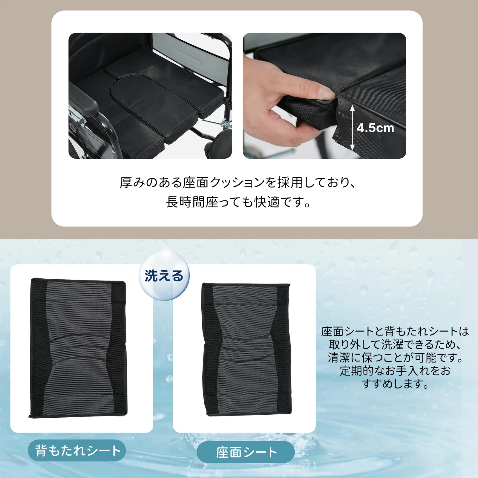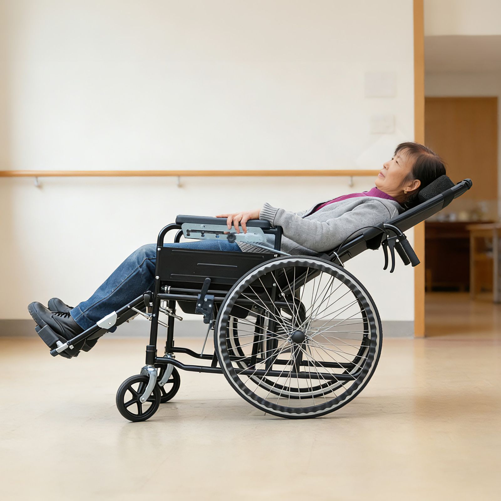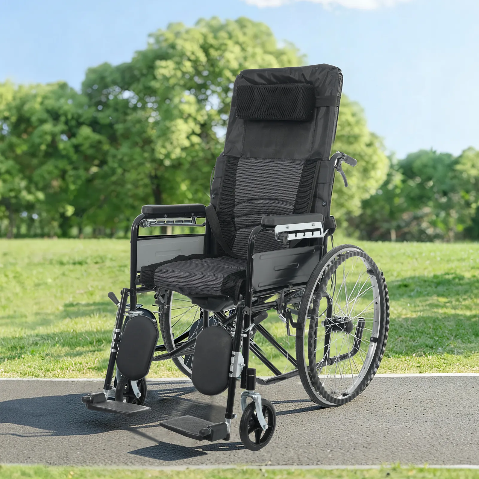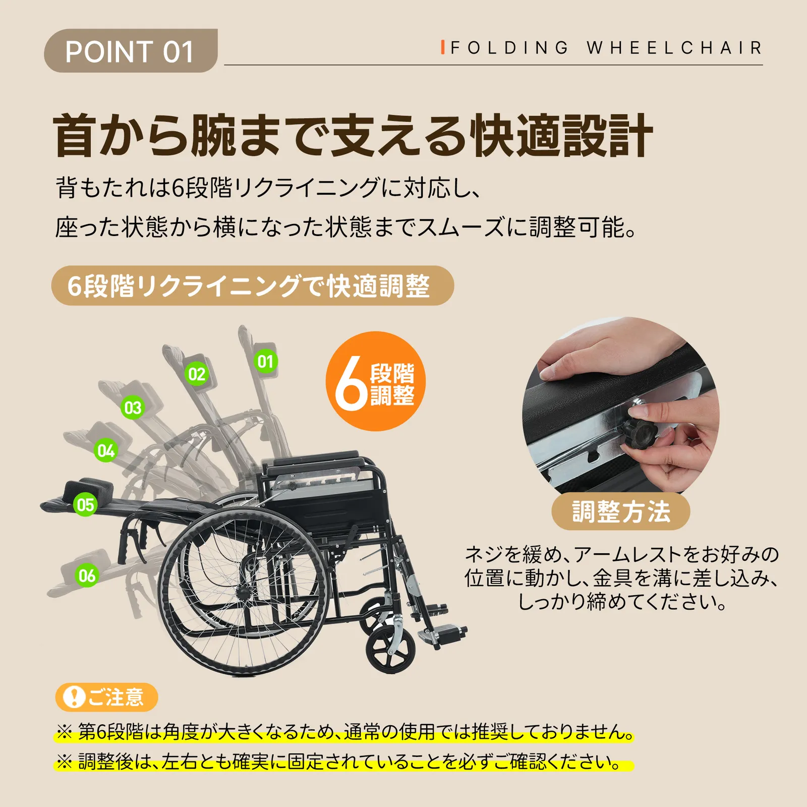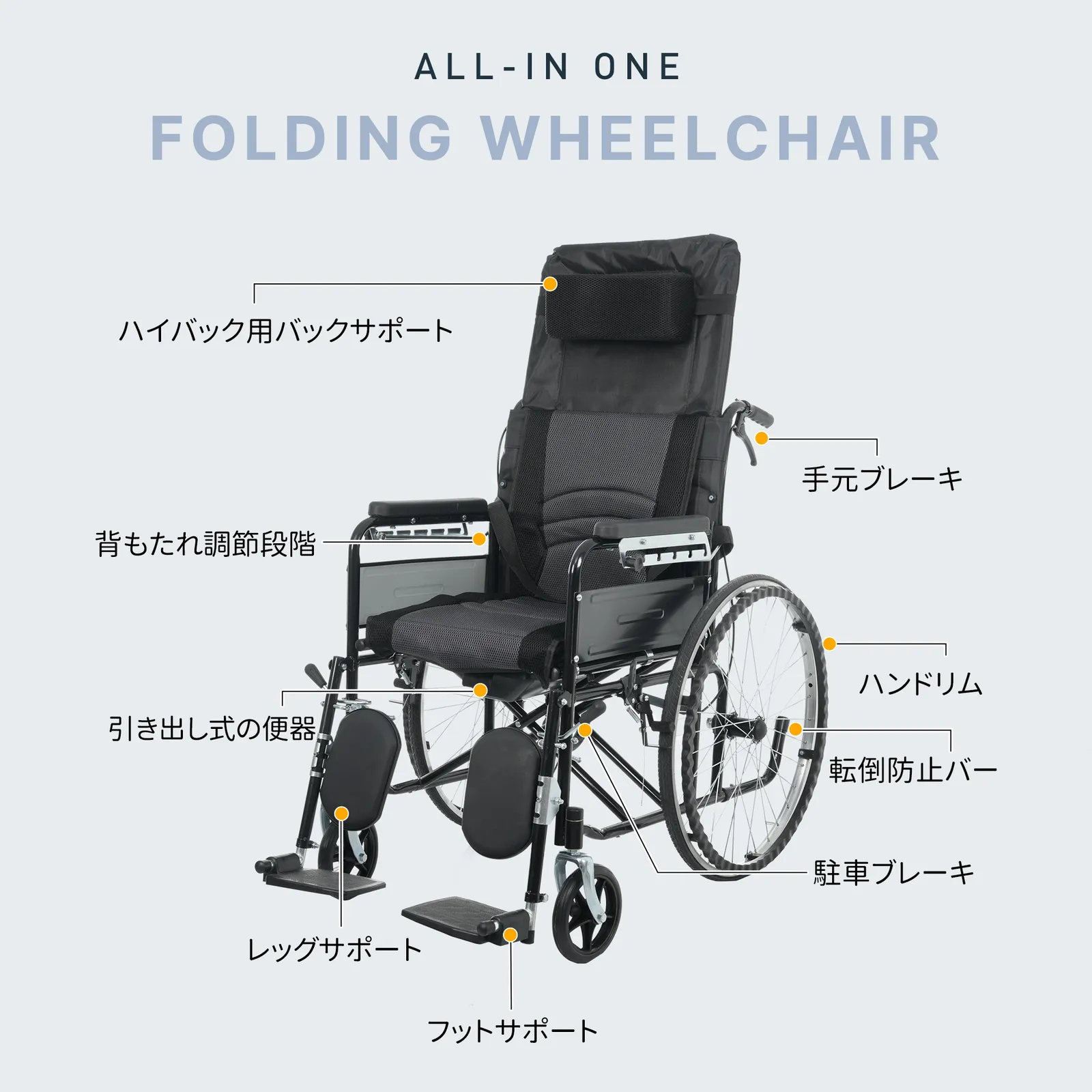 ・◎01日常の介護から外出・旅行まで、あらゆるシーンで快適に使える折りたたみ式リクライニング介護用車椅子(便器付き)。体への負担を抑えた設計で長時間の使用でも快適。介助する方・される方の双方に配慮し、毎日の介護を安心してサポートします。